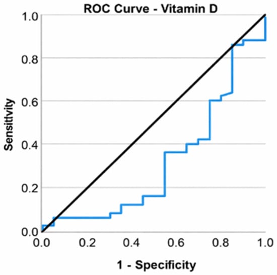 Elevating vitamin D levels resulted in a 9.6% reduction in the likelihood of patients with KOA necessitating total knee arthroplasty (OR = 0.904, CI: [0.818; 1], p = 0.049). A receiver operating characteristic (ROC) curve was used to assess the ability of vitamin D to classify patients according to the type of surgery (total knee arthroplasty or arthroscopic surgery). Vitamin D was found to be a valid predictor of the need for arthroplasty (p = 0.018), but the area under the curve (AUC) value of 0.683 indicated a poor ability to discriminate between types of interventions. An optimal cutoff could not be chosen in this case (Figure 5).