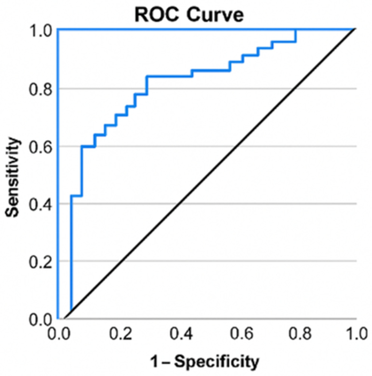 p ≤ 0.001); the area under the curve (AUC) value of 0.798 indicated a good ability to discriminate between types of interventions. An optimal cutoff could not be calculated (