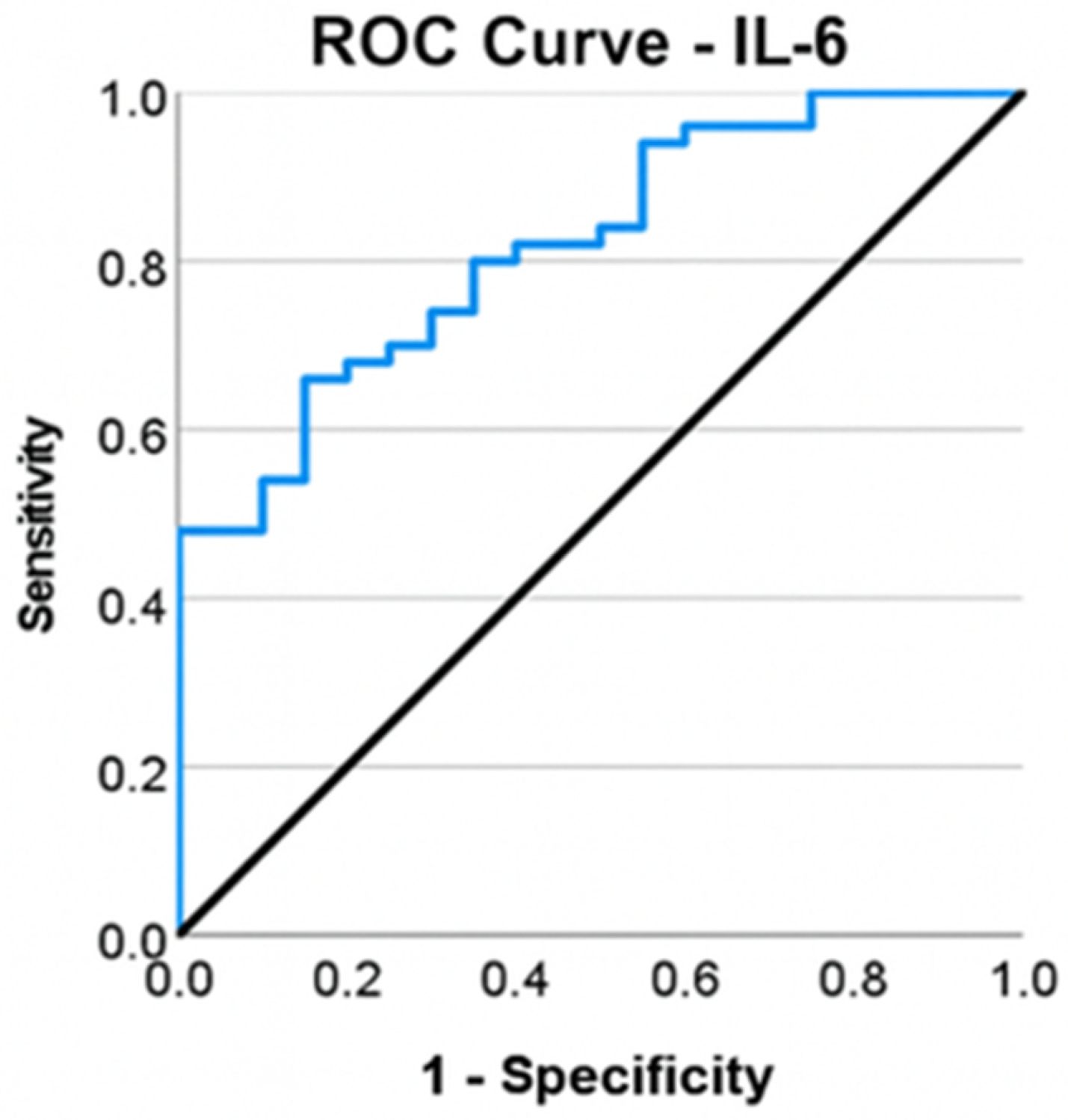 The Youden index was computed to determine the appropriate cutoff for IL-6. The coefficient’s maximum value (J = 0.51) was achieved at an IL-6 threshold of ≥4.585 pg/mL, yielding a sensitivity of 66% and a specificity of 85%.