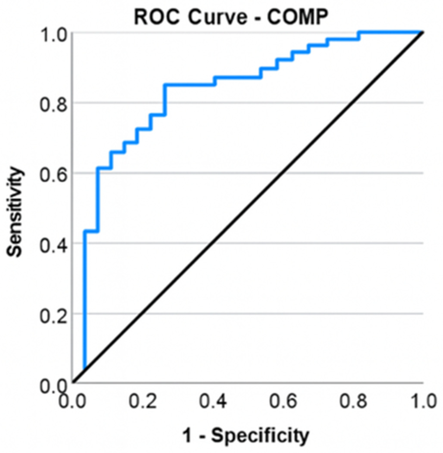 Figure 4). The Youden coefficient was determined to ascertain the optimal COMP cutoff. The highest coefficient value (J = 0.590) was achieved at a COMP cutoff of ≥11.52 ng/mL, corresponding to a sensitivity of 84% and a specificity of 75%.