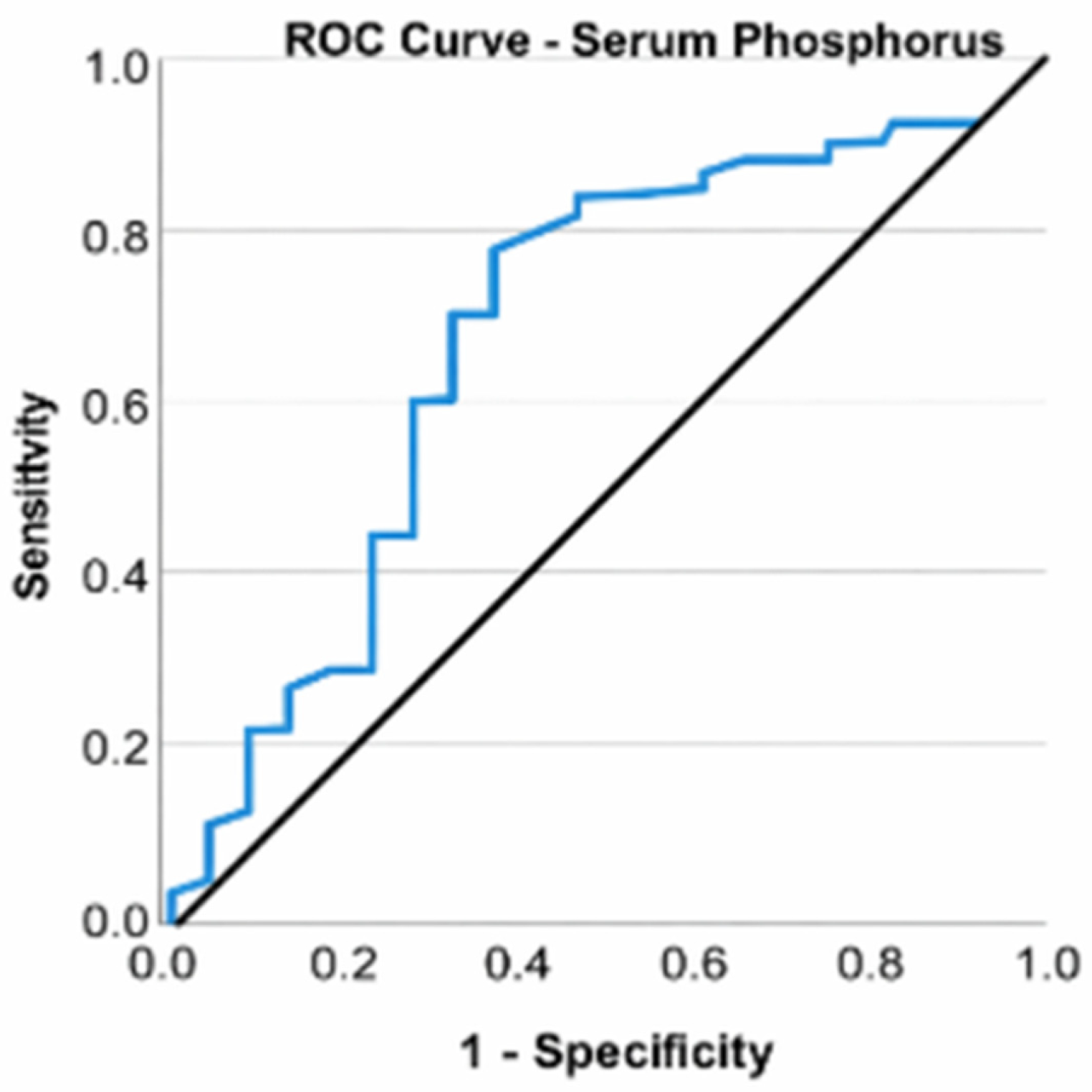 p = 0.004). A ROC curve was used to assess the ability of serum phosphorus to classify patients according to the type of surgery (total knee arthroplasty or arthroscopies). Serum phosphorus was found to be a valid predictor of the need for arthroplasty (