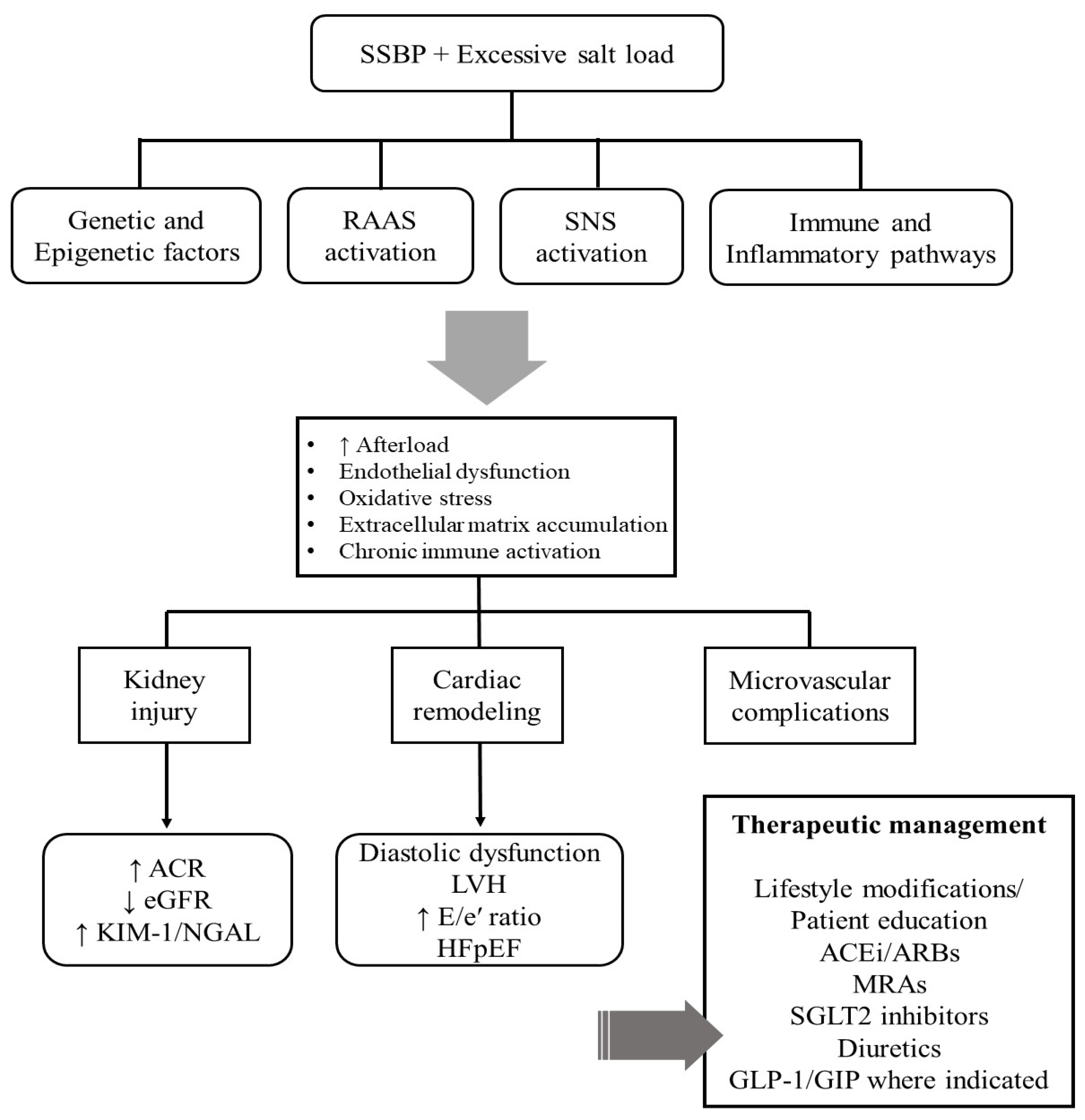 - To summarize key pathophysiological mechanisms linking sodium handling to renal and cardiovascular injury, emphasizing convergent pathways rather than exhaustive molecular detail.