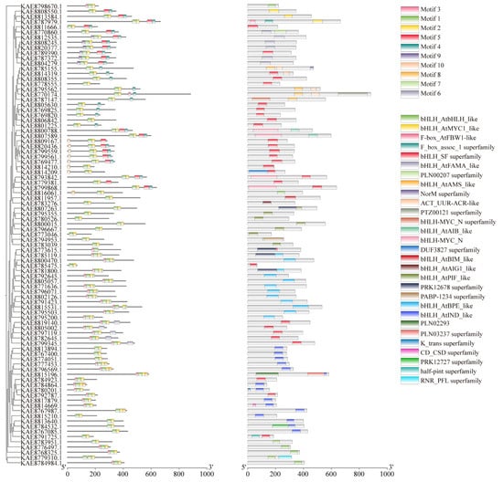 Conserved motif analysis of highland barley bHLH proteins via the MEME tool identified a total of 10 conserved motifs. The number of motifs within the bHLH gene family generally ranges from 2 to 5. All bHLH protein sequences exhibit motifs 1 and 2, which are highly conserved and distributed in tandem among all family members. Therefore, it is speculated that motifs 1 and 2 represent conserved motifs of bHLH transcription factors in young seedlings. Domain analysis revealed that bHLH proteins possess a diverse range of domains, with varying numbers of bHLH_SF superfamily domains and other different types of domains. Most bHLH genes, such as KAE8811666.1 and KAE8789390.1, contain bHLH_SF superfamily domains. Additionally, some bHLH proteins possess one or more other types of domains beyond the bHLH_SF superfamily domain. For instance, KAE8784532.1 includes bHLH_AtINDS-like and PRK12727 superfamily domains, while KAE8792645.1 features the bHLH_AtBPE-like domain (Figure 1). Visualization of the gene structures of bHLHs using TBtools revealed that members of the bHLH family contain 1 to 12 exons, with 7 members containing only a single exon. Notably, some bHLH genes had longer introns, particularly bHLH7, bHLH40, and bHLH82 (Figure S2A).