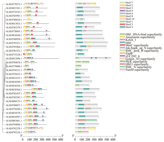 Conserved motif prediction for HSF proteins in highland barley identified a total of 10 conserved motifs, with most members of the HSF gene family containing 2 to 7 motifs. Motif 2 is present in all 28 HSF protein sequences, and Motif 1 is present in all 29 HSF protein sequences. It is speculated that Motif 1 and Motif 2 are important components of HSF transcription factors in highland barley seedlings. Motif 7 appears in 8 members, and Motif5 appears in 26 members, suggesting that HSF proteins with similar motif structures and functions are also similar among HSF members. Structural prediction of HSF proteins encoded by members of the highland barley HSF gene family showed that 24 out of 34 HSF family members contain HSF domains, KAE8807601.1 contains the HSF1 superfamily domain, and 9 members contain the HSF1 DNA-binding superfamily domain. In addition, a small number of members contain other domains, such as KAE8812096.1 containing the zf-C2H2-6 domain and KAE8792066.1 containing the ZapB domain. (Figure 4). In the analysis of gene structure, it was found that among the 34 members of the HSF gene family in highland barley, there are 1–8 exons, and 9 genes only contain 1 exon. Among them, HSF4 contains a longer intron (Figure S2F).