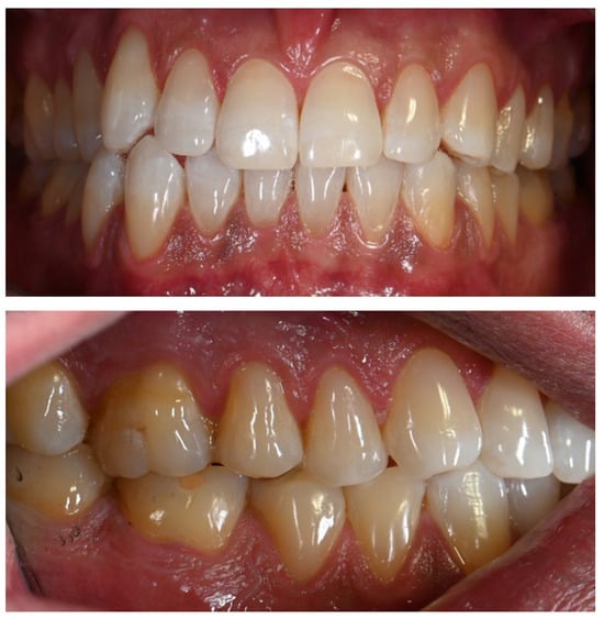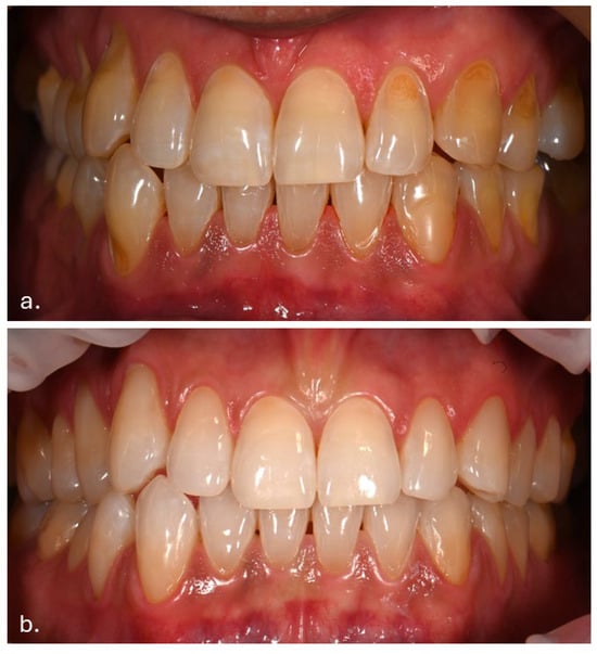 (a) Intraoral photograph taken during the patient’s initial examination, showing cervical abfractions. (b) Post-treatment photograph following restoration of the abfractions with direct composite resin.