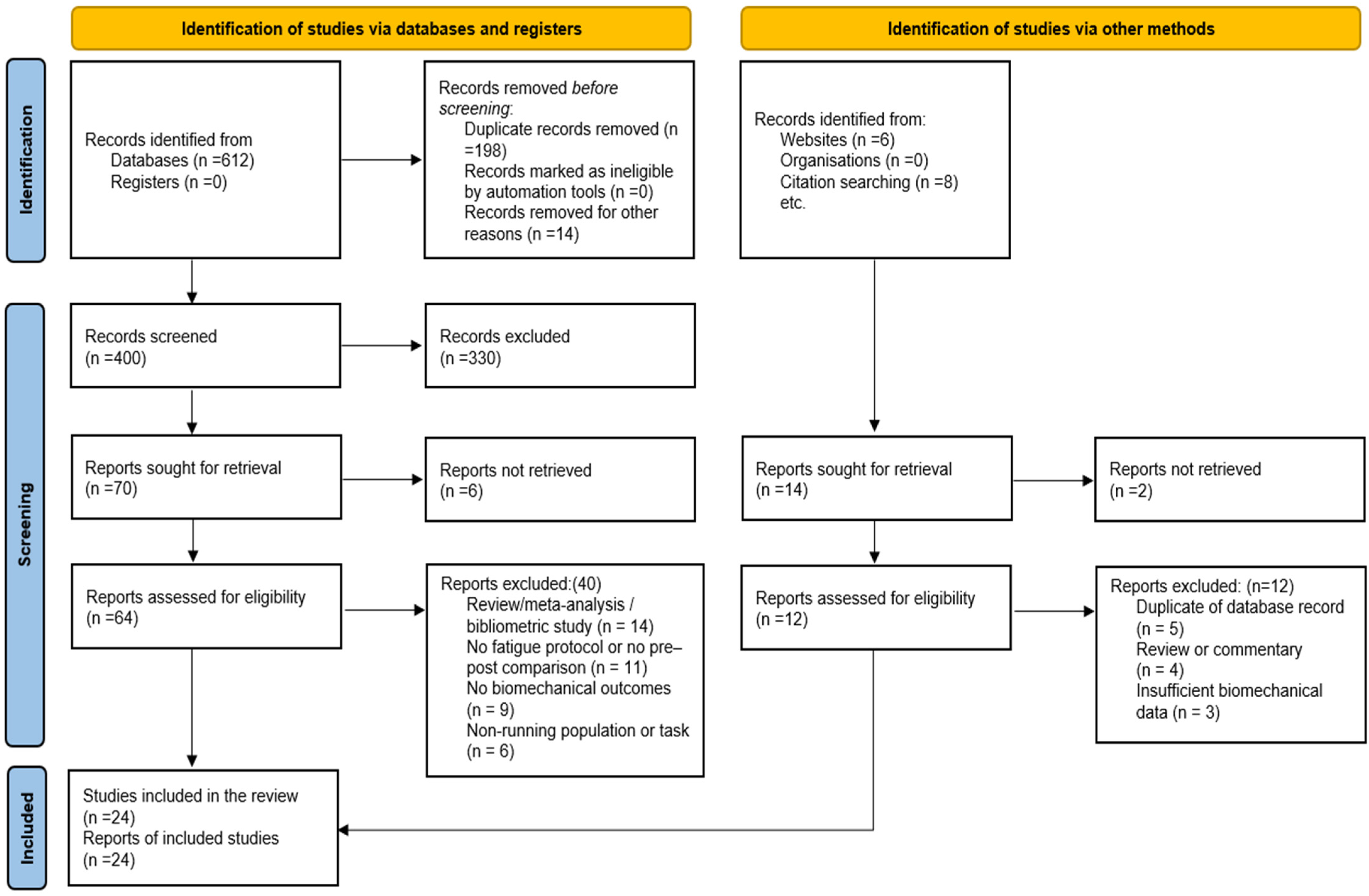 Nevertheless, the growing body of research on fatigue-related running biomechanics remains fragmented. Studies vary widely in fatigue protocols, participant characteristics, running environments, biomechanical outcome measures, and verification of fatigue. Moreover, while individual studies provide valuable insights, no consensus has yet emerged regarding the consistency, direction, and injury relevance of fatigue-induced biomechanical changes across different contexts. Importantly, systematic reviews that focus exclusively on synthesizing original experimental evidence while deliberately excluding secondary analyses such as meta-analyses and bibliometric studies remain relatively limited in the running biomechanics literature.