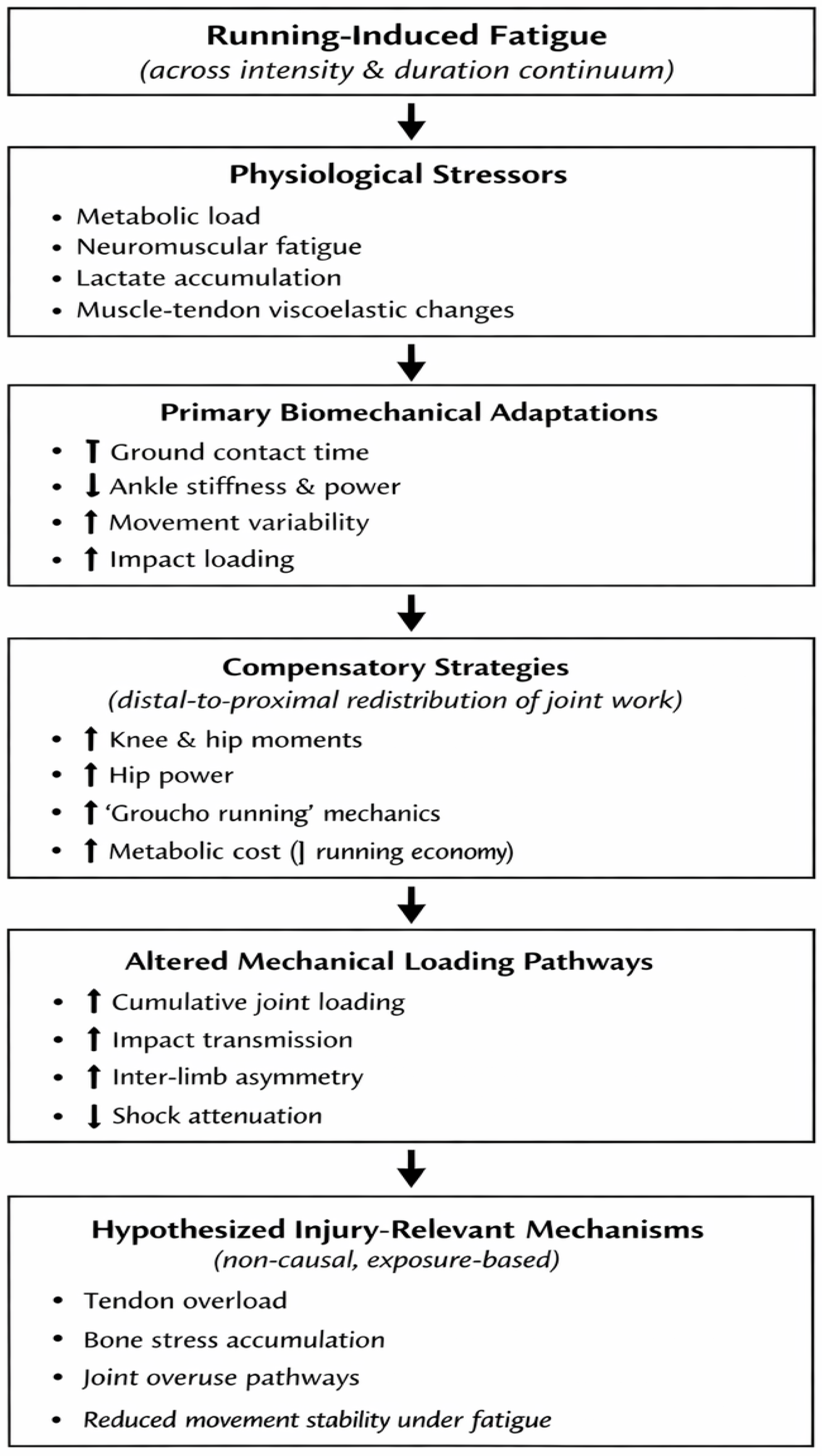 This schematic illustrates (Figure 2) how running-induced fatigue, arising across a continuum of intensity and duration, initiates physiological stressors that drive progressive biomechanical adaptations. These adaptations include alterations in spatiotemporal parameters, joint mechanics, stiffness, impact loading, and coordination. Compensatory strategies, particularly distal-to-proximal redistribution of joint work, may help preserve running performance but increase metabolic cost and modify mechanical loading patterns. The framework highlights hypothesized injury-relevant mechanical pathways rather than direct injury causation, as most included studies did not prospectively assess injury outcomes.