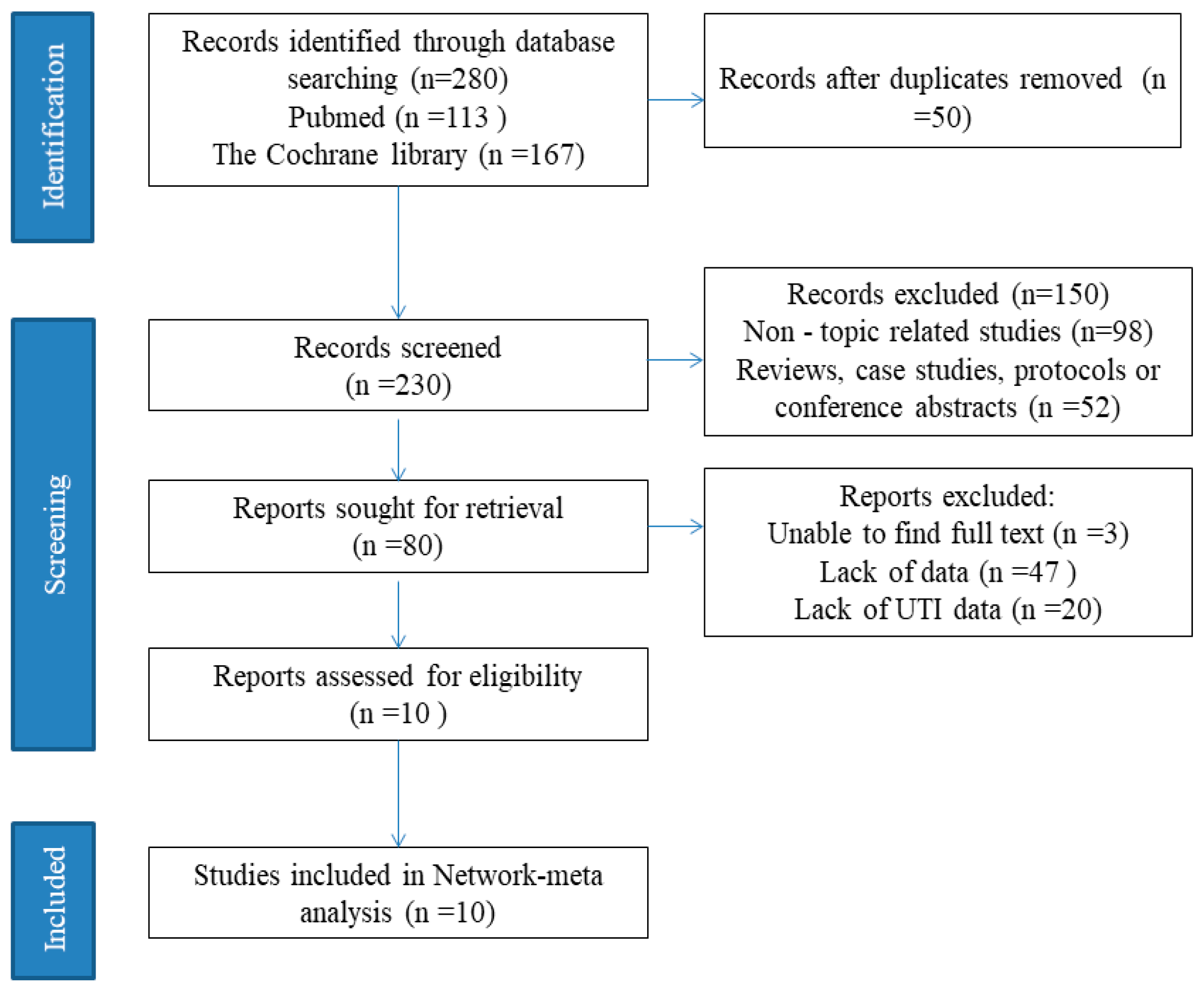| Cochrane Library | (UTI OR “urinary tract infection”) AND (suprapubic OR “intermittent catheterization” OR “indwelling catheter”) AND (postoperative OR surgery) |