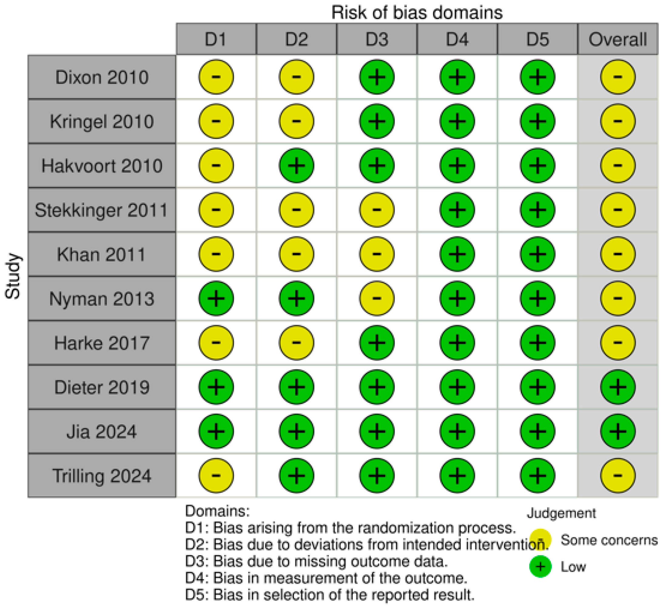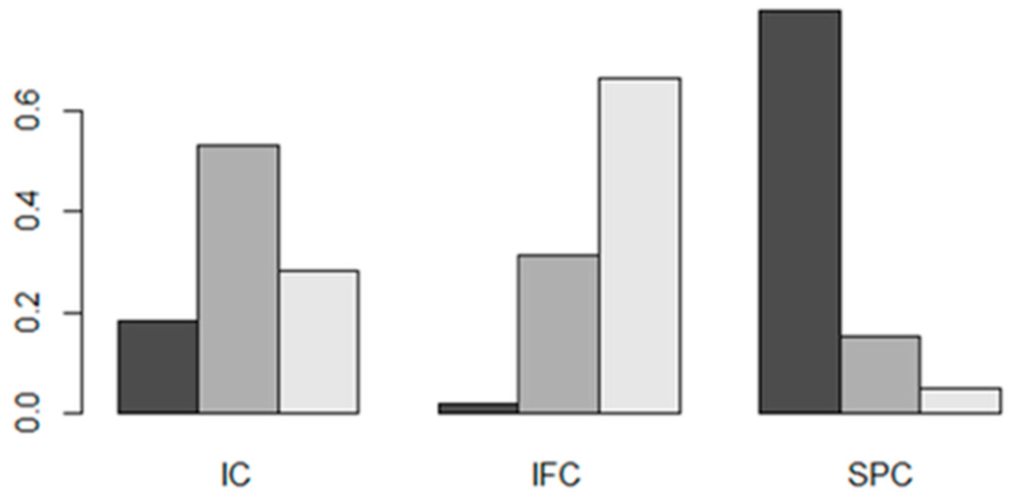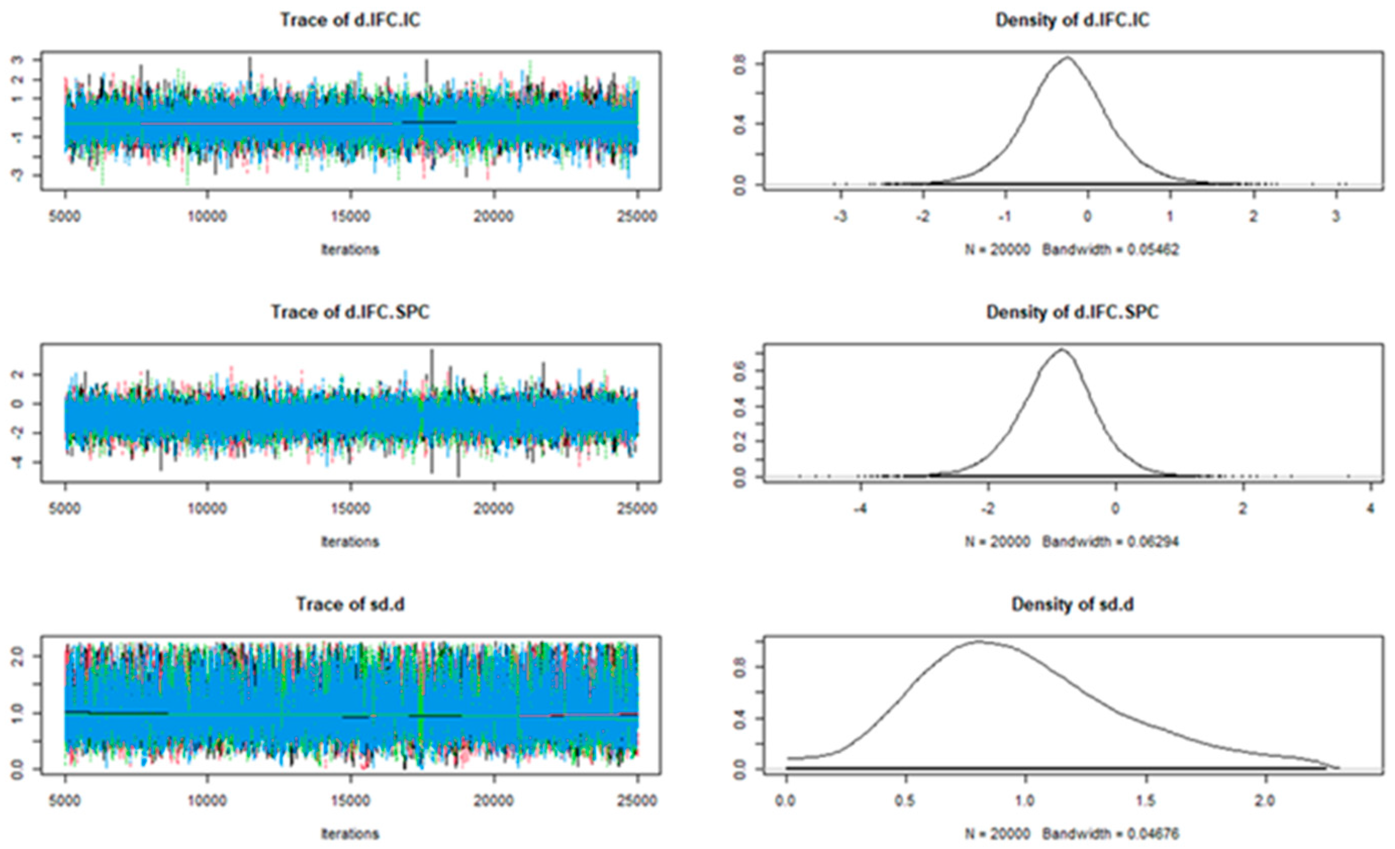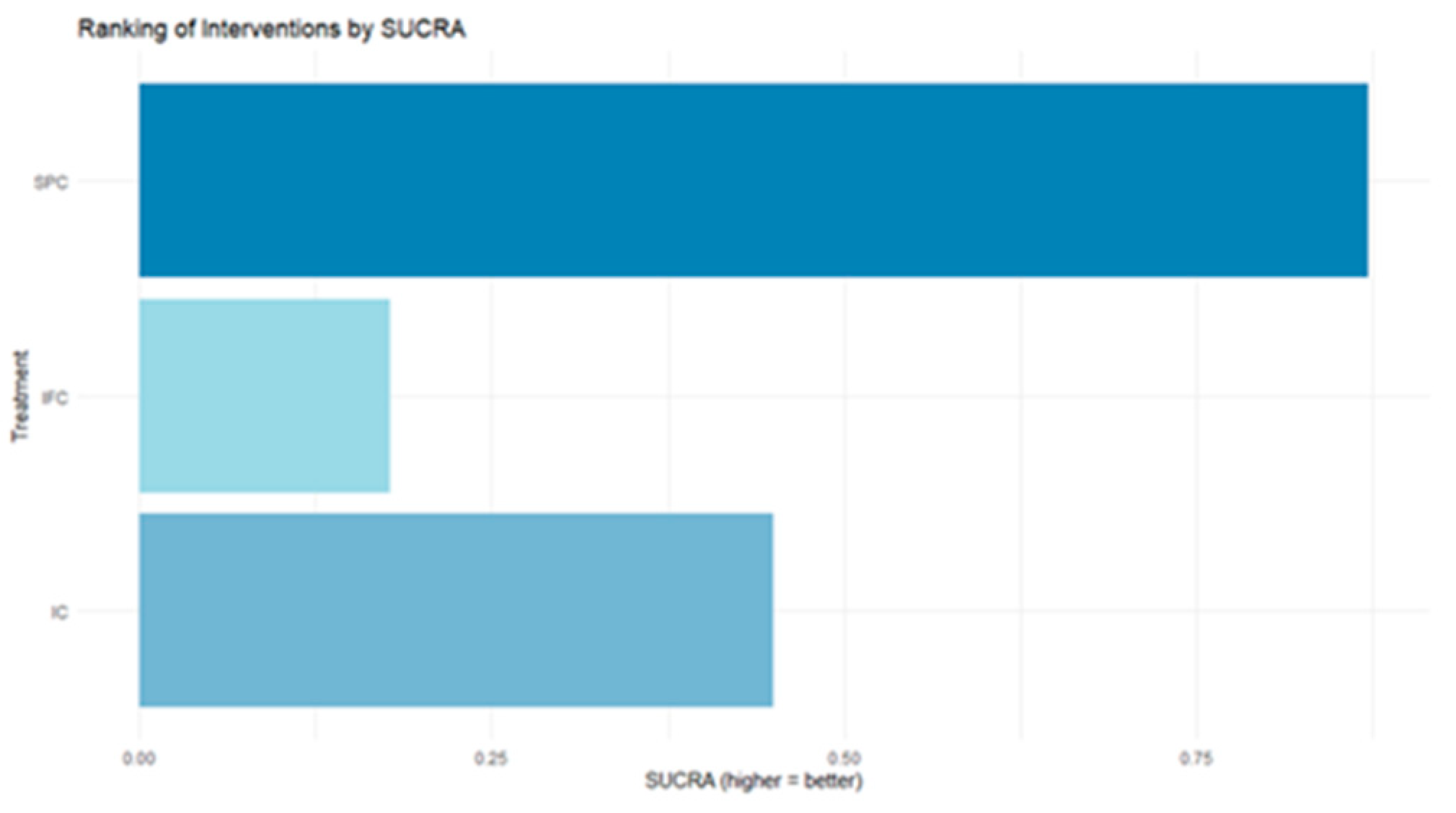 | SPC vs. IC | Indirect comparison via IFC (10 RCTs) [15,16,17,18,19,20,21,22,23,24] | 0.53 (95% CrI 0.09 to 2.69) | Not estimable | Very Low | Downgraded for indirect evidence and serious imprecision (95% CrI 0.09–2.69). |