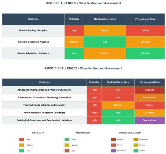 Building upon the parametric constraints defined in Section 2, this section establishes a hierarchical framework to classify challenges as either biotic or abiotic, subsequently ranking them by criticality (High, Medium, Low) through an integrated assessment of their modifiability on Mars and physiological imperative for the plant, as synthesized in Figure 1. This framework structures the subsequent analysis into biotic (Section 3.1) and abiotic challenges (Section 3.2), wherein challenges are examined in descending criticality order to elucidate their physiological mechanisms and formulate testable hypotheses, thereby establishing the logical foundation for the development roadmap in Section 4.