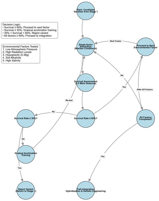 Experimental progression is governed by quantifiable KPIs based on survival thresholds. If the survival rate is ≥60% in the middle of each simulated growth period, it is considered that the potato can adapt to this environmental condition, and the next stage can be considered. If the survival rate in a certain simulation experiment is ≤30%, the potato variety needs to be trained. The simulated Martian conditions in this experiment should be adjusted in several stages, from conditions close to Earth’s natural conditions to those close to Mars’ natural conditions. When the survival rate of potatoes in the experiment is ≥60%, the next stage can begin, gradually training the potato variety until it can adapt to the Martian natural conditions. It is expected that after 2–3 Martian seasons of experiments, relatively accurate simulation data can be obtained, and potato varieties that can adapt to various single natural conditions on Mars can be identified.