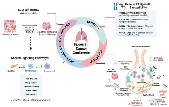 The fibrosis–cancer continuum illustrating shared pathogenic mechanisms between IPF and lung cancer. Genetic and epigenetic susceptibilities, mechanical cues, and common signaling pathways promote epithelial injury, fibroblast activation, and immune–stromal crosstalk, driving persistent fibrosis and tumor progression.