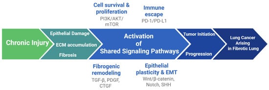 Fibrogenic-associated signal transduction pathways represent a major part of the pulmonary fibrosis–lung cancer continuum. TGFβ1 is the master regulator of lung remodeling and is often overexpressed in both diseases. In IPF, it drives the apoptosis of alveolar epithelial cells, chemoattraction of monocytes and macrophages, fibroblast activation, myofibroblast differentiation, and extracellular matrix (ECM) deposition, leading to fibrotic lesions. It is also known to elicit epithelial–mesenchymal transition (EMT) [64,65]. In the context of lung cancer, TGFβ triggers disease progression and tumor metastasis, inducing EMT and suppressing immune surveillance. It also plays an important role in tumor stroma development by activating cancer-associated fibroblasts, linking maladaptive tissue repair to malignant progression [66].