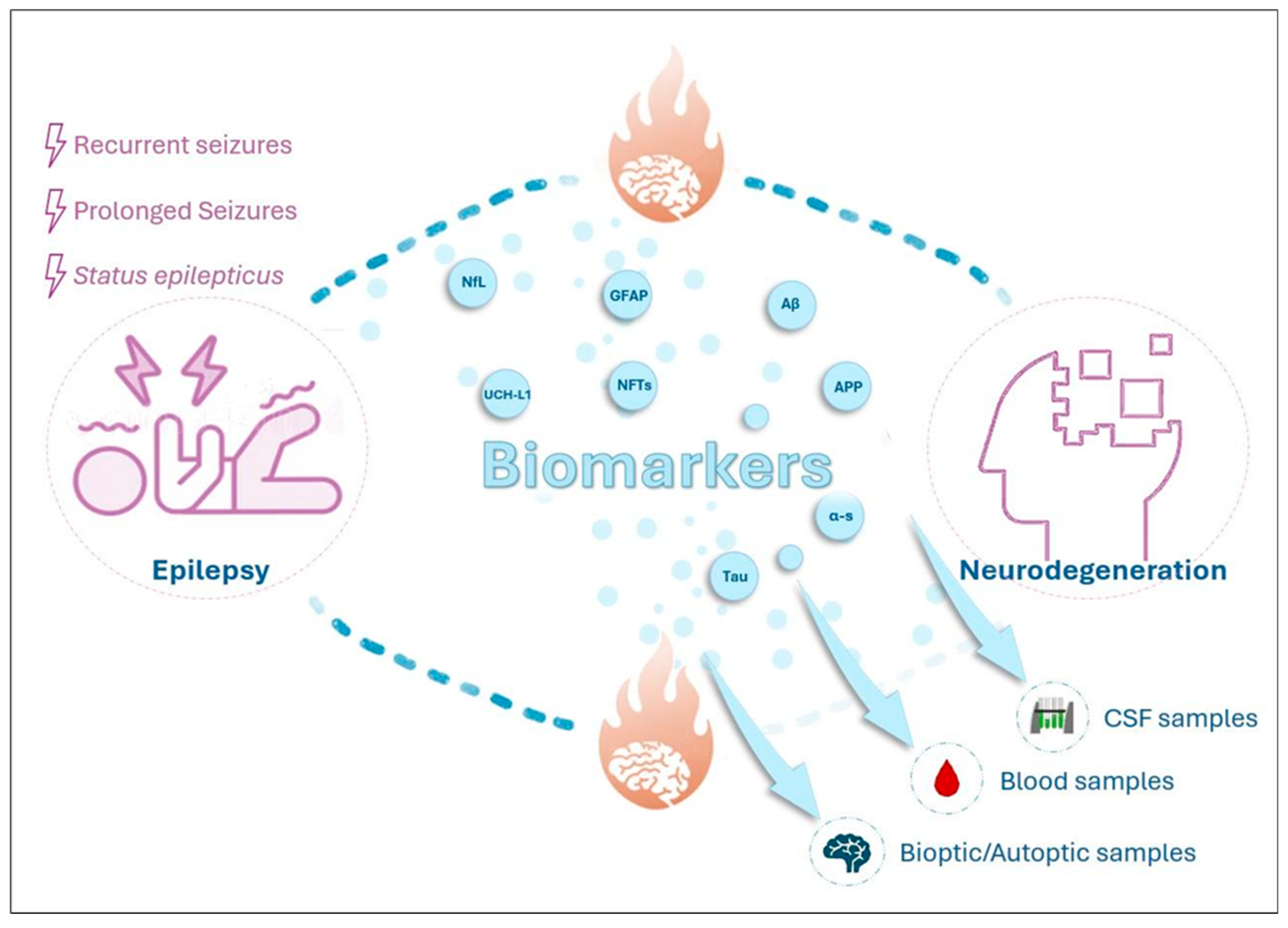 Moreover, beyond structural and functional mechanisms, metabolic factors may also influence cognitive outcomes in epilepsy [18]. This review aims to summarize current knowledge on the relationship between epilepsy and neurodegeneration, with a focus on potential biomarkers and their implications for disease mechanisms and progression. We present the biomarkers that currently attract the greatest interest in the study of epilepsy and neurodegeneration, providing an overview of the latest findings in the field.