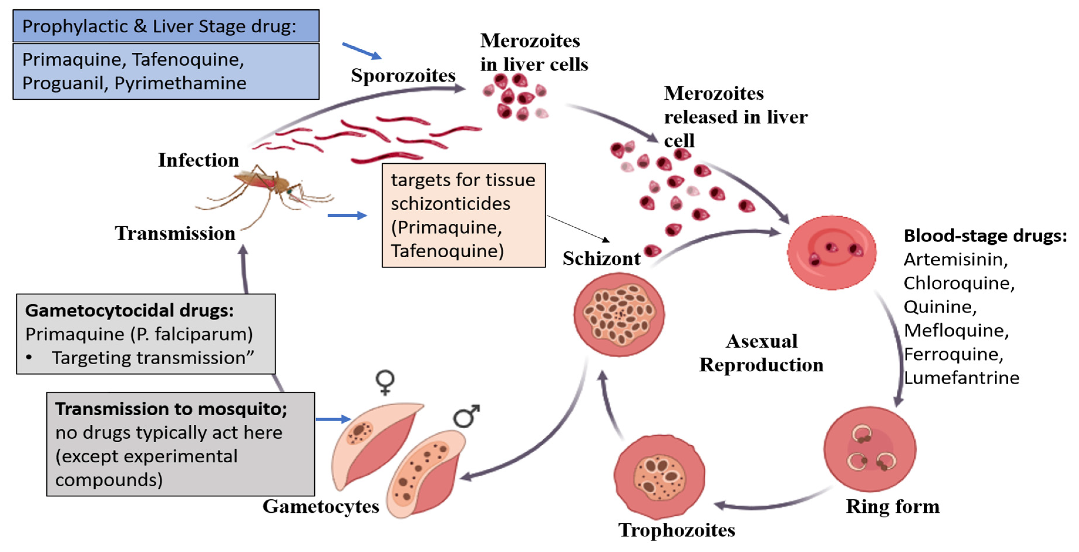 - Transmission stage: The gametocytocidal medications utilized to target this stage, such as chloroquine and artemisinin, impede sexual gametocyte formation and growth [14]. Some merozoites undergo differentiation in the bone marrow to form sexual (female and male) gametocytes, which are then consumed by Plasmodium-free female Anopheles mosquitoes through a blood meal.