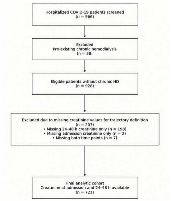 During the study period, 966 hospitalized patients with confirmed SARS-CoV-2 infection were screened. We excluded 38 patients with pre-existing chronic hemodialysis. Of the remaining 928 patients, serum creatinine at admission and within the first 24–48 h was available in 721 patients, who constituted the primary analytic cohort. Among the 207 excluded due to missing creatinine for pattern definition, 198 had admission creatinine but lacked a 24–48 h value, 2 lacked admission creatinine but had a 24–48 h value, and 7 lacked both time points. Patient selection is visualized in Figure 1.