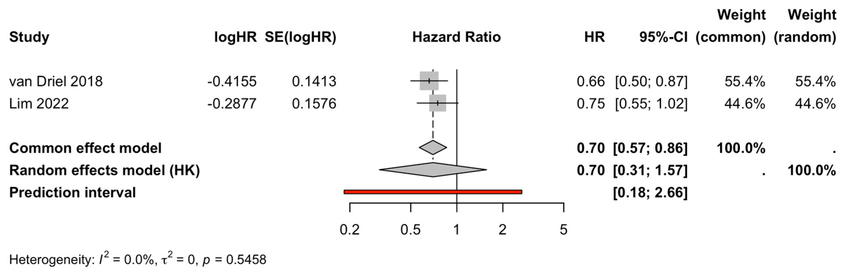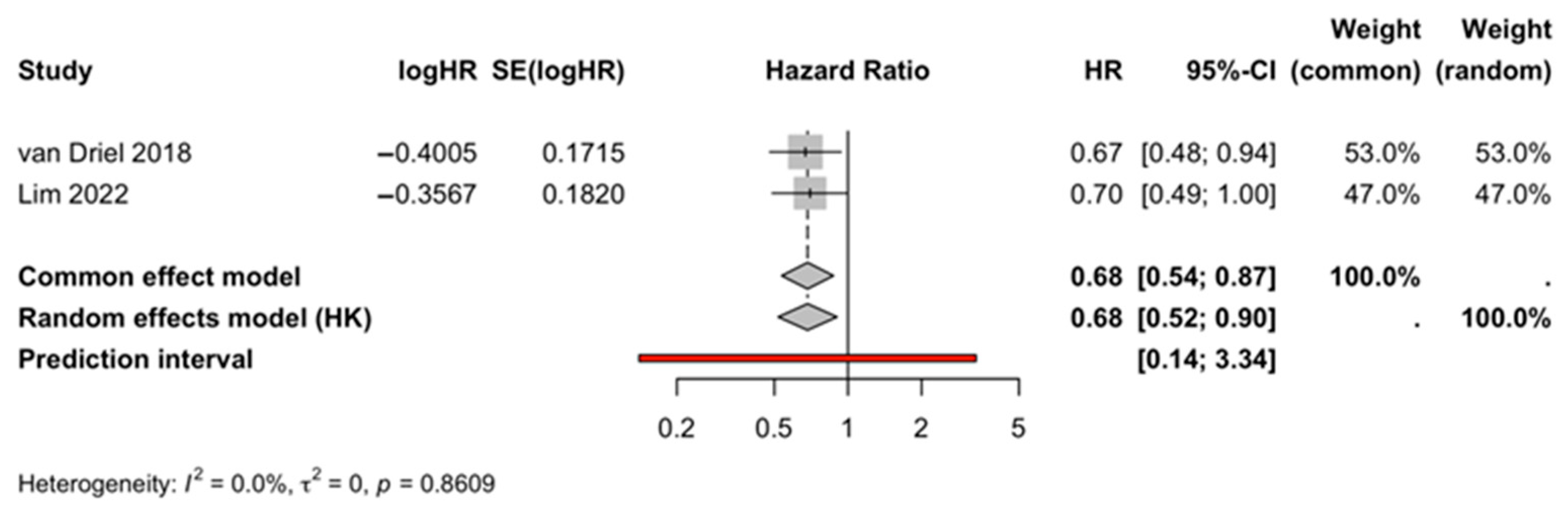 | Overall Survival (Os) | 2 | 217 | HR | DL/Hartung–Knapp | 0.68 (0.52–0.90) | 0.0023 | 0.0 | 0 | 0.8609 | 0.14–3.34 |