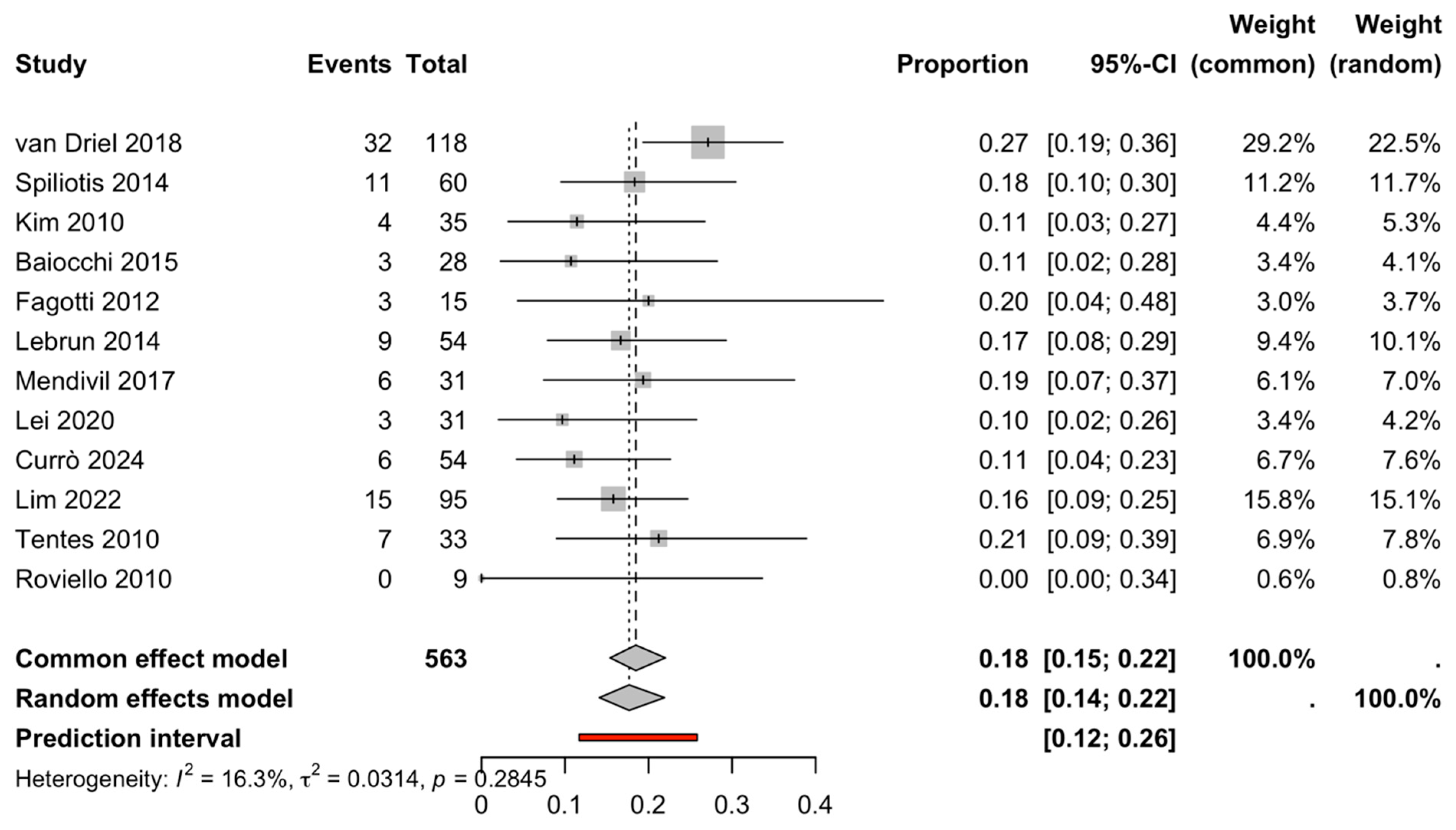 | Grade Iii–Iv Complications | 12 | 563 | Proportion | DL/Hartung–Knapp (PLOGIT) | 0.18 (0.14–0.22) | — | 16.3 | 0.0314 | 0.2845 | 0.12–0.26 |
