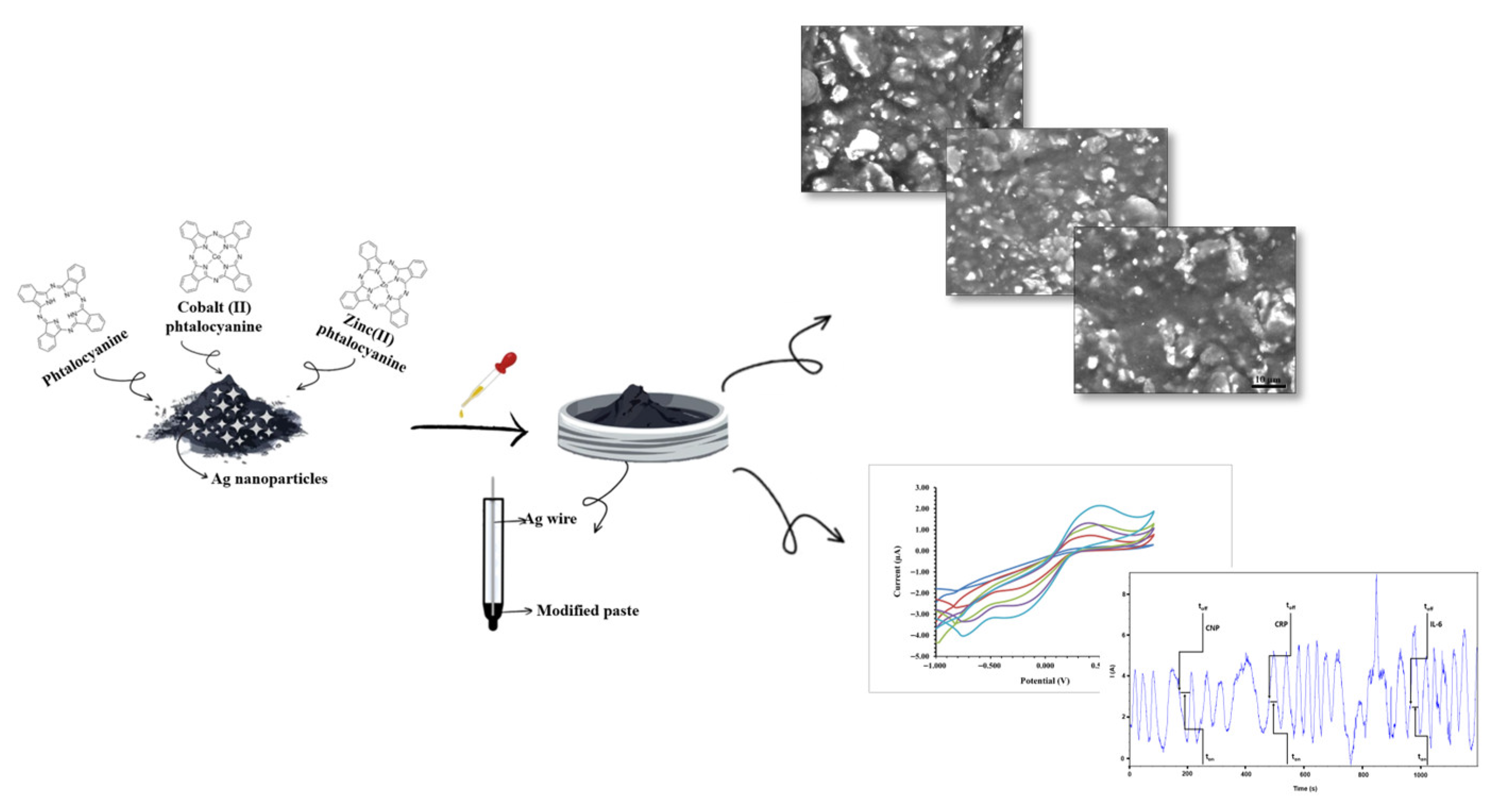 Analytical-grade carbon nanopowder, AgNPs, phthalocyanine (H2Pc, tetrabenzo[b,g,l,q]-5,10,15,20-tetraazaporphyrin), cobalt (II) phthalocyanine, and zinc phthalocyanine were acquired. Monosodium and disodium phosphate, C-NP, CRP, and IL-6 were acquired from Sigma Aldrich in Milwaukee (WI, USA). Fluka was the supplier of the paraffin oil.