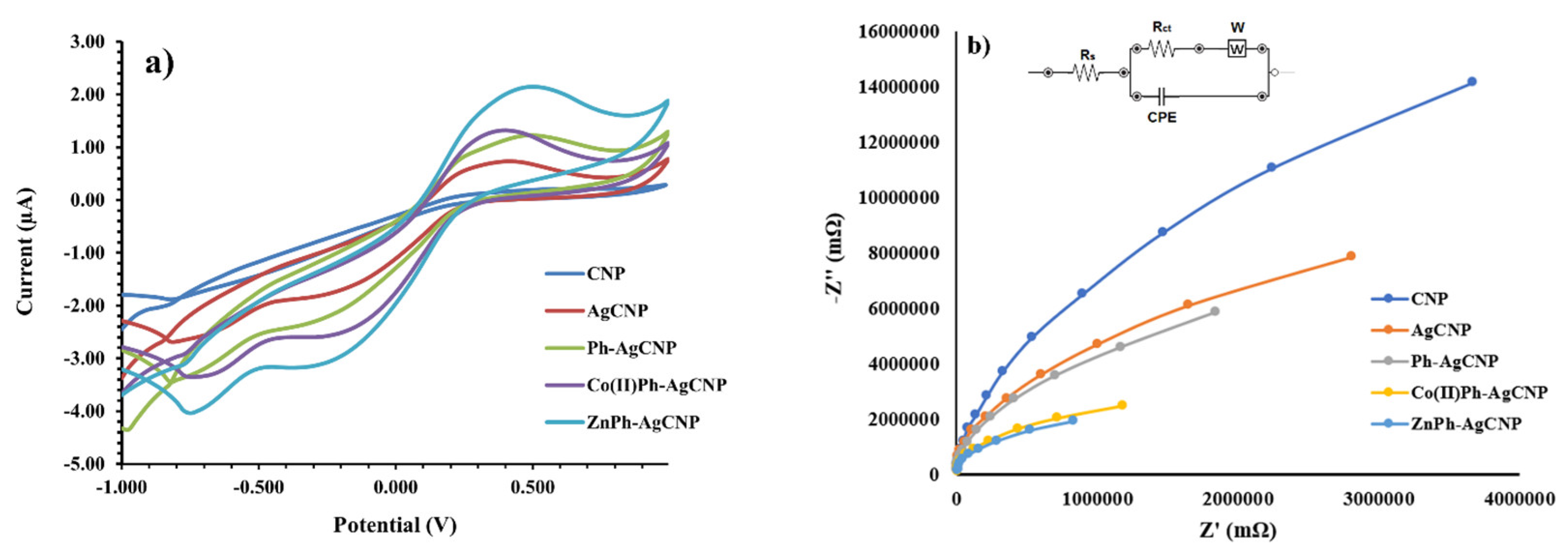 To conduct an analysis and evaluation of the performance of the three modified sensors in addition to the performance of the sensors that were not modified, cyclic voltammetry (CV) and electrochemical impedance spectroscopy (EIS) were utilized. In order to conduct the CV measurements, carbon nanopowder (CNP), silver–carbon nanopowder (AgCNP), Ph-AgCNP, Co(II)Ph-AgCNP, and ZnPh-AgCNP were utilized as the working electrodes. Experiments were conducted in a solution that contained a mixture of potassium ferrocyanide (K3[Fe(CN)6]) and potassium chloride (KCl) at a concentration of 0.1 M. The experimental potentials ranged from −1.0 V to 1.0 V.