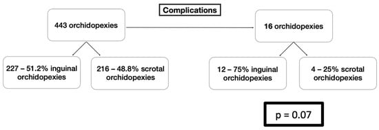 After dichotomizing the data based on the preoperative diagnosis and applying the Fischer’s Exact Test, a positive relation was found between the diagnosis of congenital UDT and the presentation of complications (Figure 1). The relation was statistically significant. A possible explanation for this finding may lie in the pathogenesis of these two conditions. Although the testicular descent is a complex process including either genetic, hormonal, environmental, or anatomical factors, no matter what the leading cause is, the presentation of congenital cryptorchidism is always accompanied by the abnormal growth of the gubernaculum and its elements (cremaster muscle, genitofemoral nerve) and the affected development of the processus vaginalis [24,25]. On the other hand, the retractile testis is a clinical condition in which the testes are descended into the scrotum after birth; in later life, and spontaneously, they ascend outside the scrotum, by the cremaster muscle reflex activity, which is induced by the genitofemoral nerve [26]. The phenomenon of retractile testis has traditionally belonged to normal variants, and only a few reports have associated it with inguinal–scrotal anatomical abnormalities, such as a patent processus vaginalis [27]. In the authors’ point of view, the distinct pathogenesis of the congenital cryptorchidism and the retractile—ascending testis, which result in defined differences in inguinal–scrotal anatomy and function, offer a possible explanation for the different occurrence of postoperative complications.