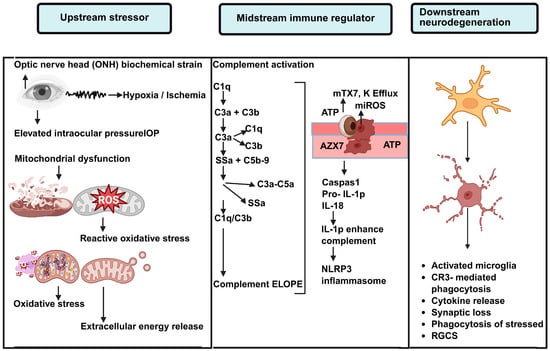 At midstream, local complement activation in the retina and optic nerve head (ONH), particularly involving C1q, C3, and C5, leads to erroneous tagging of stressed synapses and neuronal components. While complement supports tissue homeostasis, in glaucoma, the chronic activation of complement drives maladaptive synaptic pruning, phagoptosis of stressed but still viable cells, and membrane attack complex (MAC) associated cellular stress [21]. The complement-derived anaphylatoxins, C3a and C5a, further exacerbate the inflammation by activating resident glial cells. Simultaneously, the NLRP3 inflammasome integrates upstream danger signals in glaucoma, including biomechanical stress/strain at the ONH, mitochondrial dysfunction, oxidative stress, hypoxia, and extracellular ATP release. After priming and activation, NLRP3 triggers the caspase-1-dependent maturation of the pro-inflammatory cytokines IL-1β and IL-18. These cytokines cause further synaptic disintegration, disruption of axonal transport, and inflammation within the retina and ONH [22]—see Figure 1.