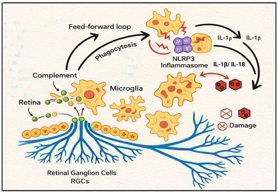 Complement activation, NLRP3 signaling, and microglial reactivity form interconnected components of an inflammatory network in glaucoma, even though they are often studied separately. Their interdependence seems to indicate that they form a positive feedback loop, rather than a linear cascade. This interdependence could bring together upstream biomechanical and metabolic stress, sustained neuroinflammation, and the progressive degeneration of retinal ganglion cells (RGCs) [38]. Immune activation is a resultant response of elevated and fluctuating intraocular pressure, biomechanical strains at the optic nerve head (ONH), ischemia, mitochondrial dysfunction, oxidative stress, extracellular ATP release, and the sequence of events that unfold at the retinal and ONH tissue during glaucoma. While these do not directly eliminate RGCs, they do, however, trigger the immune system. At this point, complement activation and NLRP3 signaling are the main stress signal amplifiers [48]. Complement system components (C1q, C3, C5) are upregulated at stressed neuronal membranes and synapses, and the anaphylatoxins (C3a, C5a) activate glial cells and increase the expression of inflammatory proteins. At the same time, NLRP3, as a result of ATP–P2X7 signaling, mitochondrial ROS formation, potassium efflux, and the presence of oxidized mtDNA, drives the activation of the inflammatory caspase-1 and the maturation of the inflammatory cytokines IL-1β and IL-18. Notably, the pathways described above operate bidirectionally. NF-kB-dependent transcriptional mechanisms may work to activate the components of the NLRP3 inflammasome by priming inflammasome assembly. On the other hand, the IL-1β class of inflammasomes is responsible for further increasing the expression of genes associated with the complement system, leading to increased activity of the complement system. Even without increases in IOP, the sustained, self-priming states of inflammation can be maintained by the processes described above. At the level of the downstream effectors, microglia respond to complement [51].