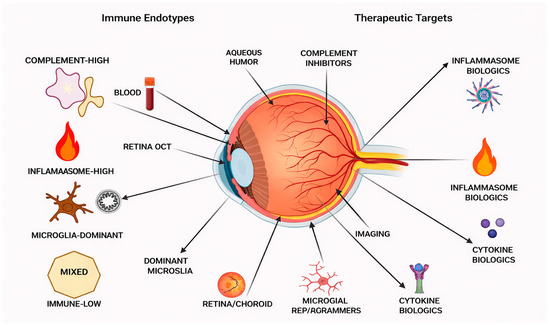Measurable, reproducible, and mechanistically interpretable biomarkers, if available, can facilitate the construction of a reliable stratification system. One potential area of predictive modeling is ocular fluid profiling. During scheduled surgical procedures, researchers can obtain aqueous humor samples and quantify the immune profiles in both cytokines (e.g., IL-1β, TNF-α, IL-6), chemokines, and complements (e.g., C3a, C5a, iC3b) to record the immune tone in proximity to the retina and ONH (optic nerve head) in real time. Imaging-linked inflammation is another potential domain [78]. Hyperreflective foci can be spotted on structure-light OCT, and microglial-like cell aggregates can be identified in Adaptive Optics with downstream molecular imaging. Synaptic suppression may indicate upstream microglial activation and complement-mediated suppression of neural circuitry [79]. A third domain, systemic immune signatures, captures peripheral cytokines, and transcriptomic panels can quantify priming of the immune system that is both peripheral and biased toward the retina. A fourth system employs predictive modeling of polygenic and genetic data related to specific pathways. Complement regulatory genes, inflammasomes, and microglial-modulating genes could facilitate the prediction of the immune-dominant phenotype. Finally, a set of immune functioning stress tests (e.g., ex vivo assays, monocyte models, or microglial models) may yield personalized parameters of immune reactivity.