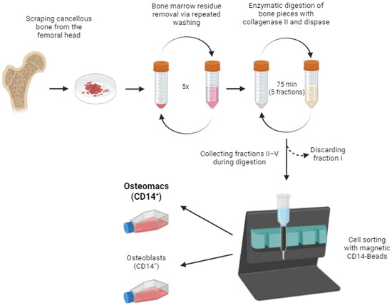 Schematic representation of the study protocol. The detailed protocol is described in the methods section (Step-by-Step protocol for the isolation of osteomacs). Image created in BioRender. Bousch, J. (2025) https://BioRender.com/u93k231 (accessed on 10 July 2025).