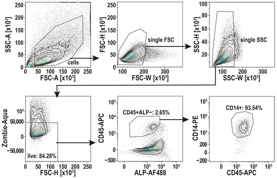 Alternatively, to address this issue, we performed fluorescence-activated cell sorting (FACS) to ensure a highly enriched macrophage population for analyzing the proliferation capacity of osteomacs without osteoblast contamination. After the isolation of osteoblasts and osteomacs, as described in steps 1–8 of the “Step-by-Step Protocol for the Isolation of osteomacs.”, the cells were cultivated until confluency. These confluent cultures were detached with Accutase and filtered through a 40 µm cell strainer. After blocking Fc receptors to avoid non-specific antibody binding, the cells were stained with a Live/Dead staining and fluorophore-conjugated antibodies for CD14 (Clone REA599), CD45 (Clone 2D1), and ALP (Clone 8B6). Using a BD FACSymphonyTM S6, the osteomac cell fraction (CD14+ CD45+ ALP−) was sorted in α-MEM with 1% Pen/Strep and 20% FCS supplemented with 10 ng/mL M-CSF. ALP was stained on live cells as a surface marker (no fixation/permeabilization) and was used exclusively to exclude ALP+ osteoblasts during gating of the CD45+CD14+ population. Single-stained controls were used for compensation. The gating strategy for cell sorting is depicted in Figure 2.