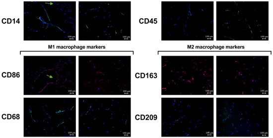 Macrophage surface marker expression of osteomacs isolated by MACS®. The immunofluorescence (IF) images show staining for the macrophage markers CD14, CD45 and markers for M1-like (CD86 and CD68) and M2-like macrophage polarization (CD163, CD209) together with nuclei staining by using DAPI (blue). Arrows indicate thread-like configuration of some osteomacs. Shown here are representative IF images. IF staining was performed with n = 2 donors.
