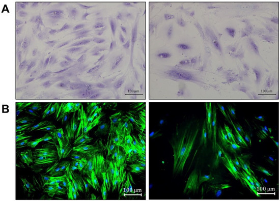 OMs were seeded at 50% confluency in appropriate culture vessels. Cells were fixed with 4% paraformaldehyde (PFA) for 15 min at room temperature (RT) and washed with phosphate-buffered saline (PBS). For toluidine blue staining, cells were incubated with 0.3% toluidine blue solution for 1–3 min at RT. Excess dye was removed by rinsing the cells with double-distilled water (ddH2O) until the wash solution appeared clear. For actin filament visualization, cells were permeabilized with 0.1% Triton-X-100 for 10 min at RT. Cells were then incubated with Alexa Fluor Plus 647-phalloidin (Invitrogen, Carlsbad, CA, USA) for 60 min at RT. Following incubation, cells were counterstained with DAPI (1:1000) for 10 min at RT and washed with PBS. Fluorescence and bright-field images were taken using a Keyence BZ-X800 microscope (Keyence, Osaka, Japan) using a 20× objective.