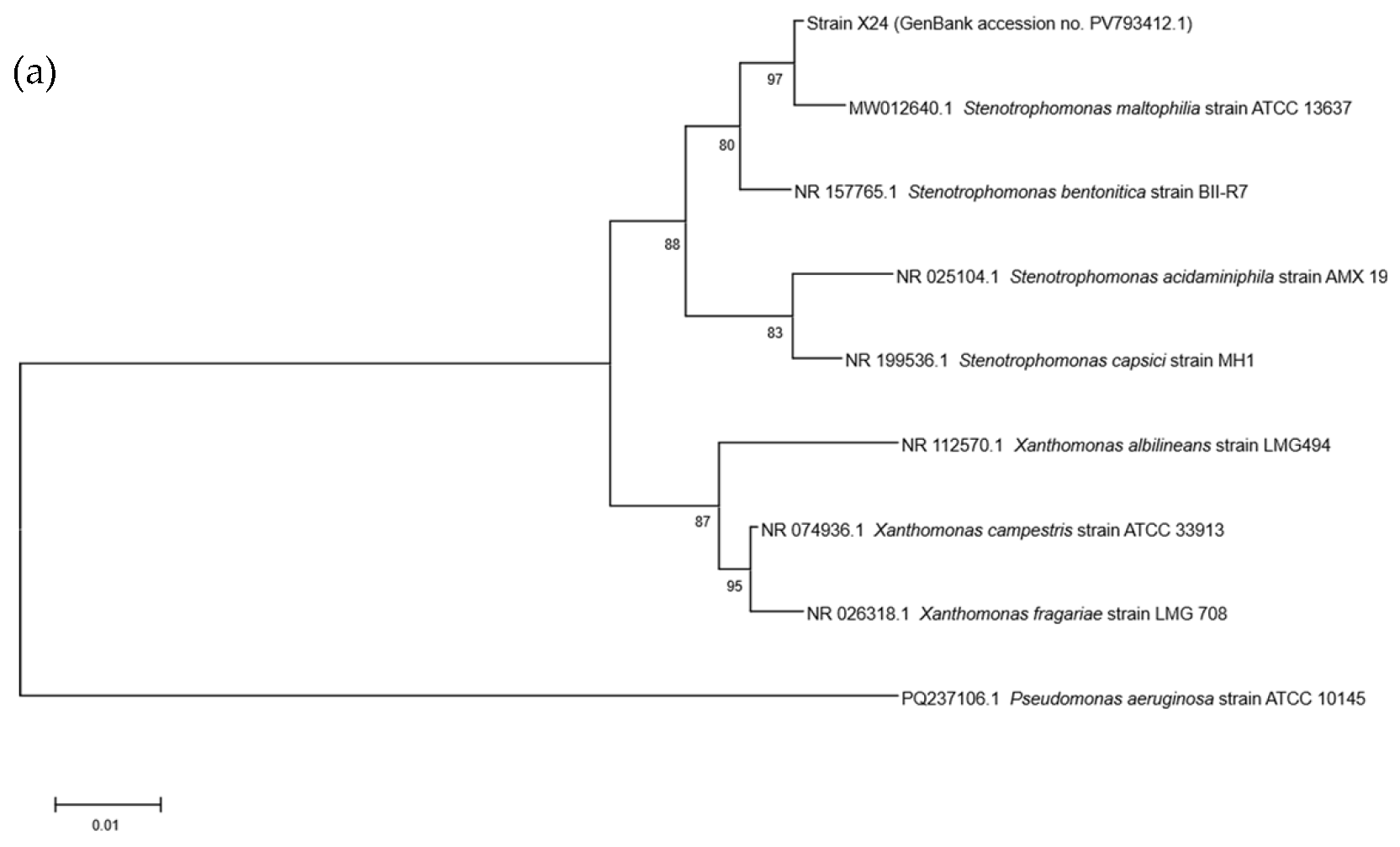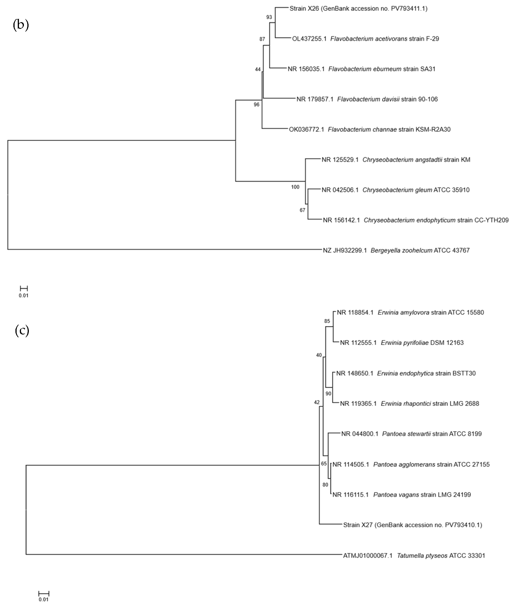 3.2. Taxonomic Identification of the Selected Bacterial Strains