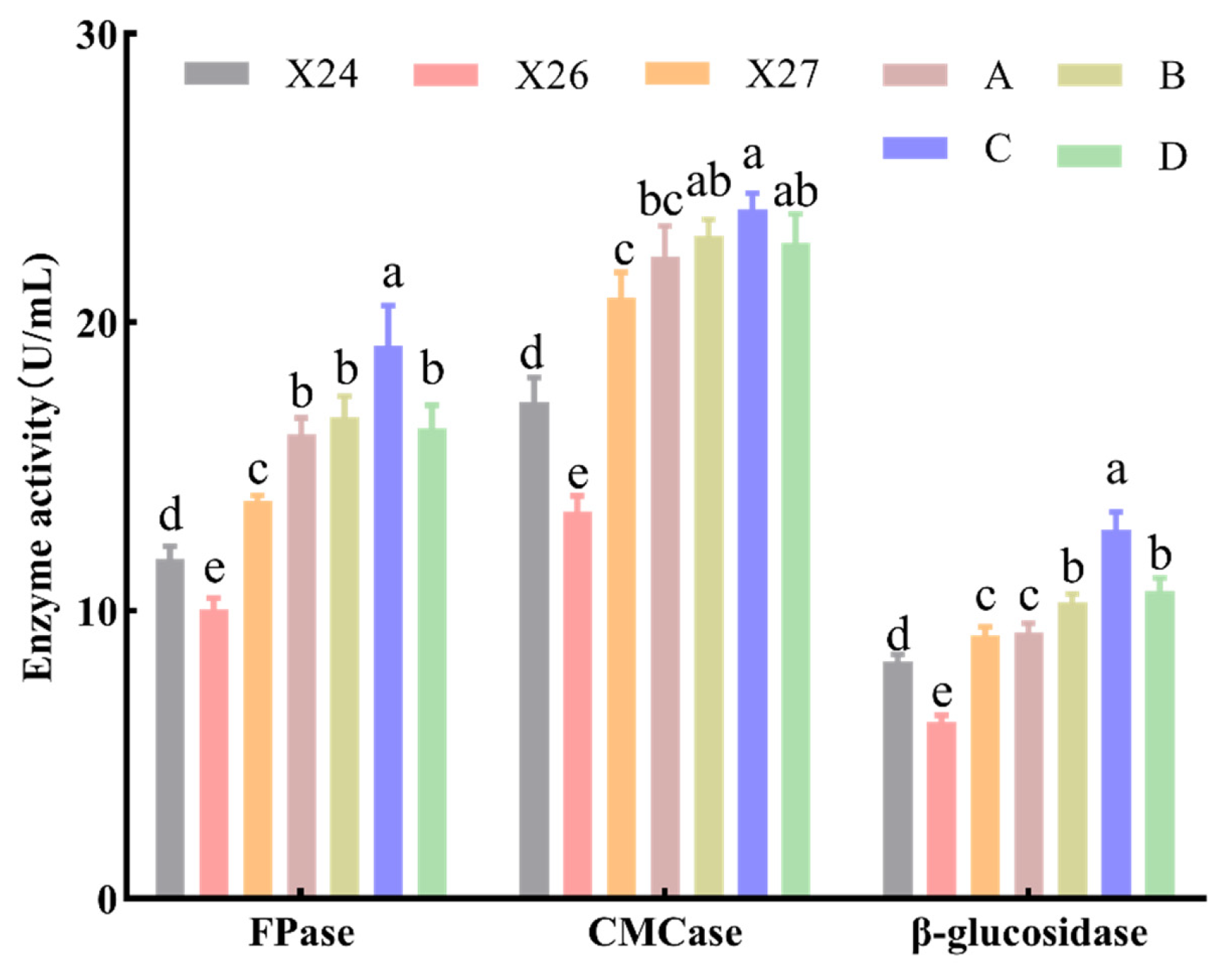 3.3. Cellulolytic Potential of Individual Strains and Synthetic Mixtures