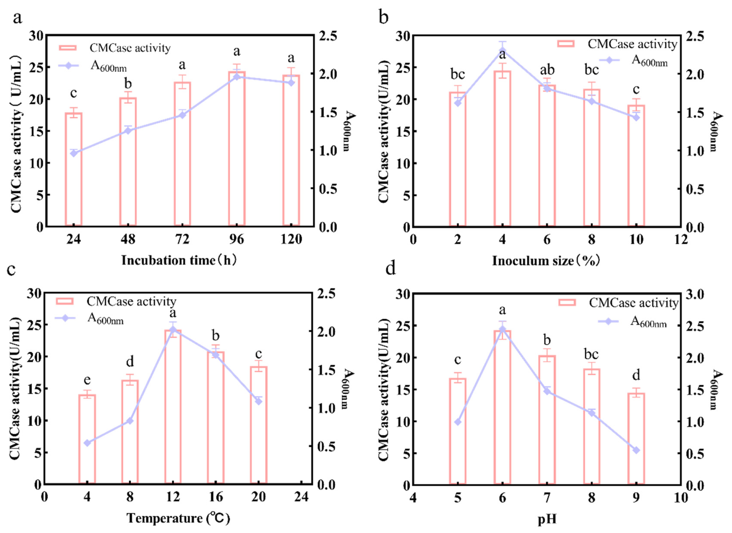2.6. Optimization of Culture Conditions for Cellulase Production