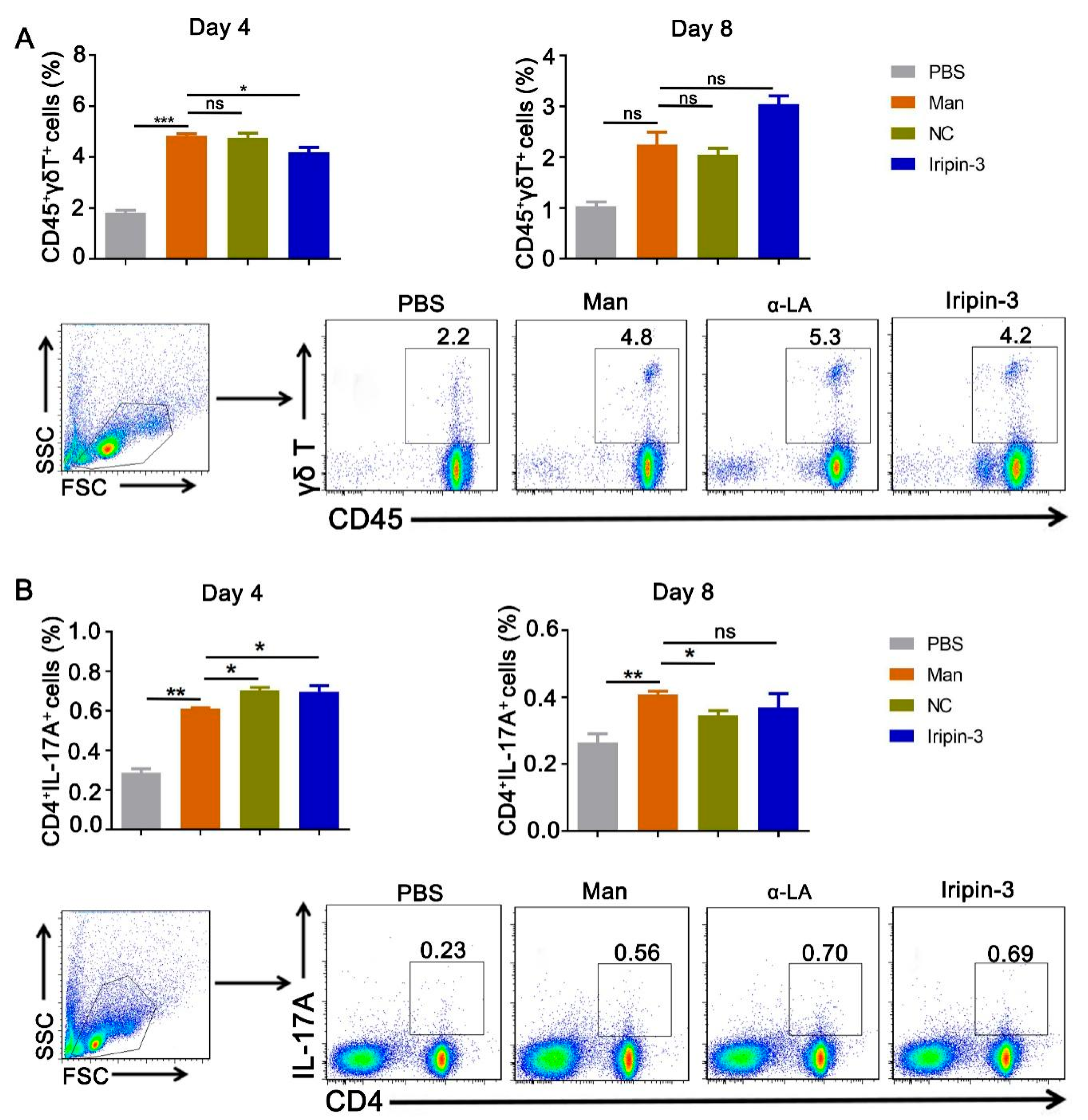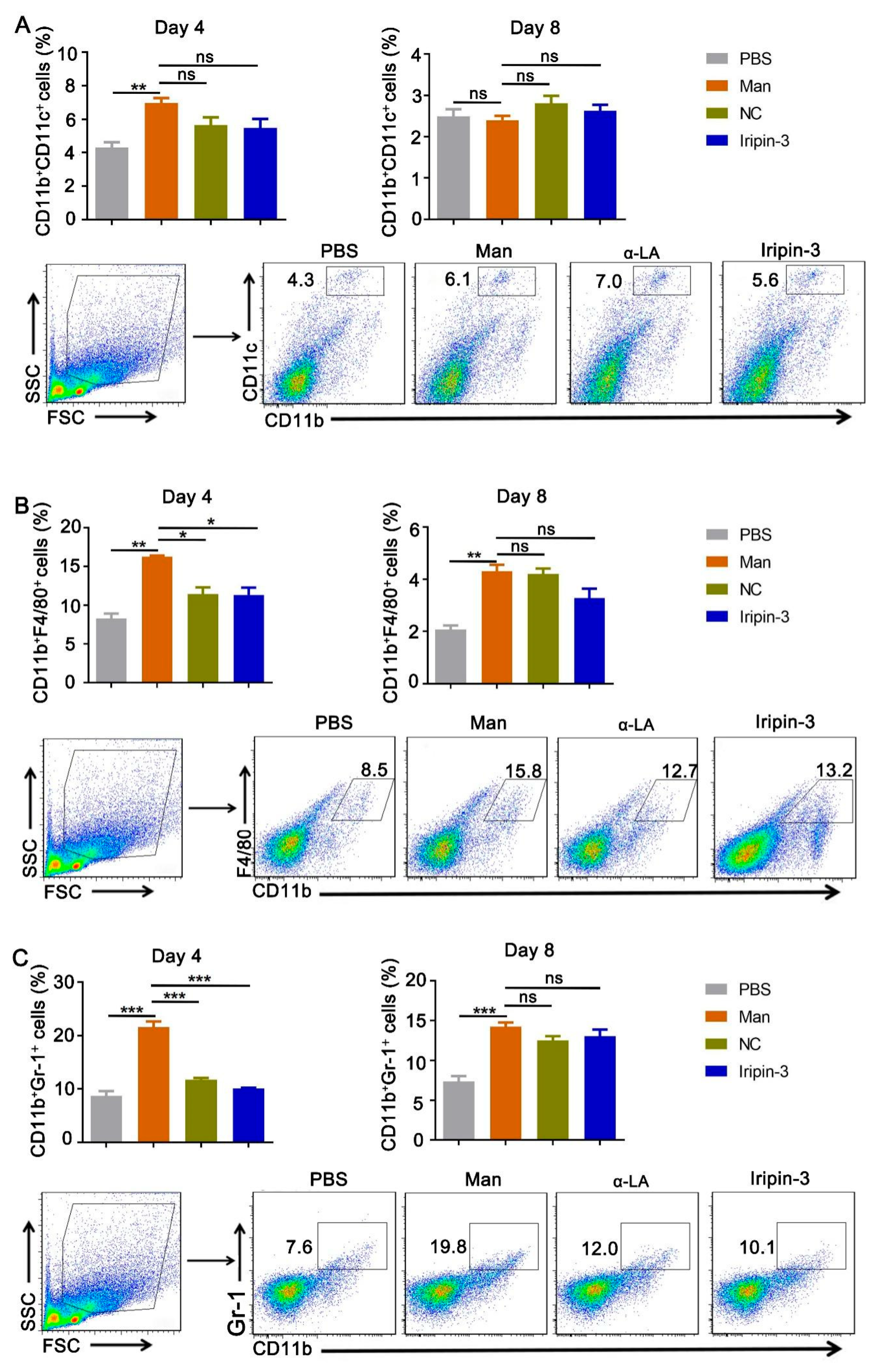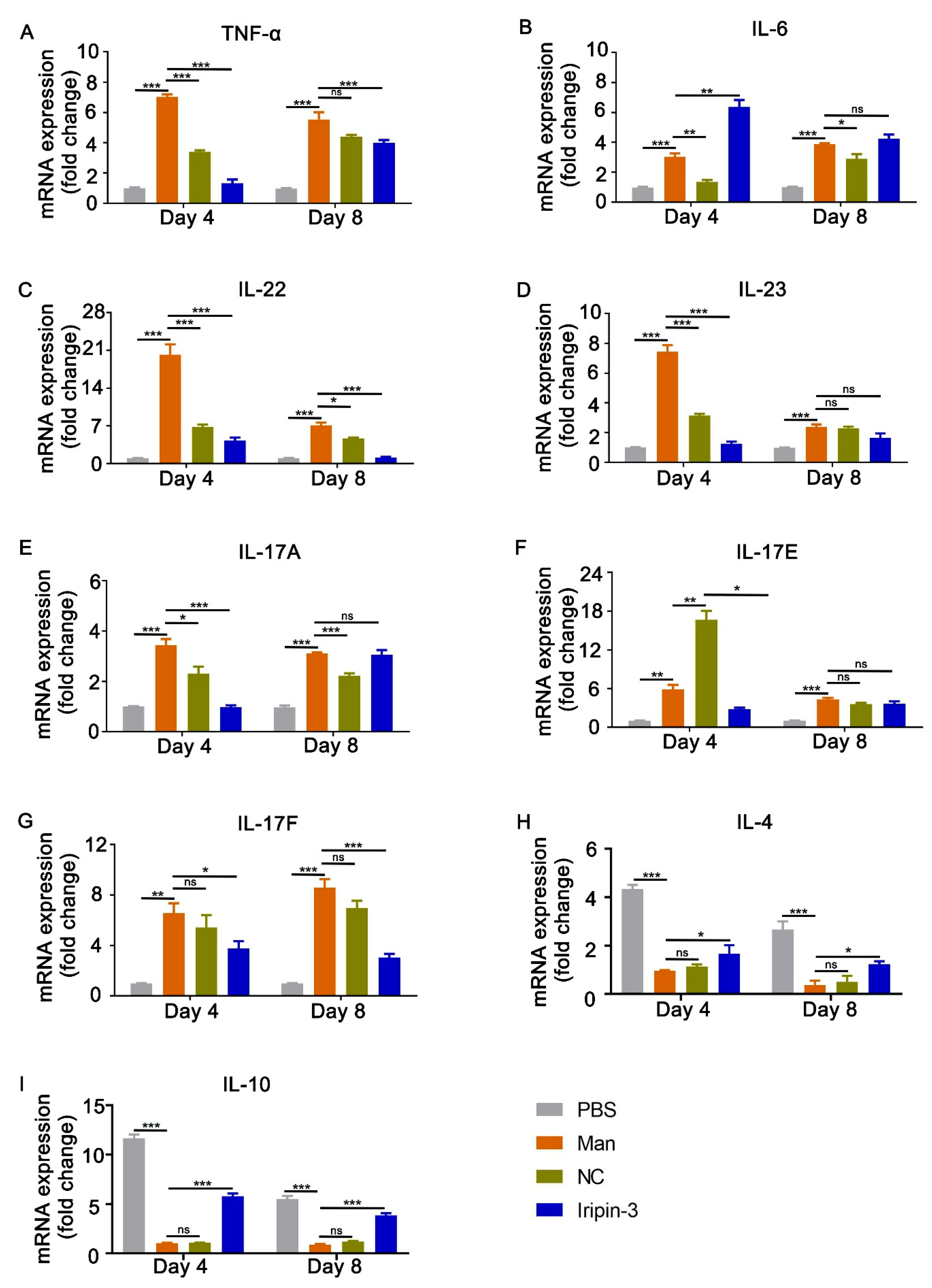 | Cytokine | Day 4 PBS | Day 4 Man | Day 4 NC | Day 4 Iripin-3 | Day 8 PBS | Day 8 Man | Day 8 NC | Day 8 Iripin-3 |