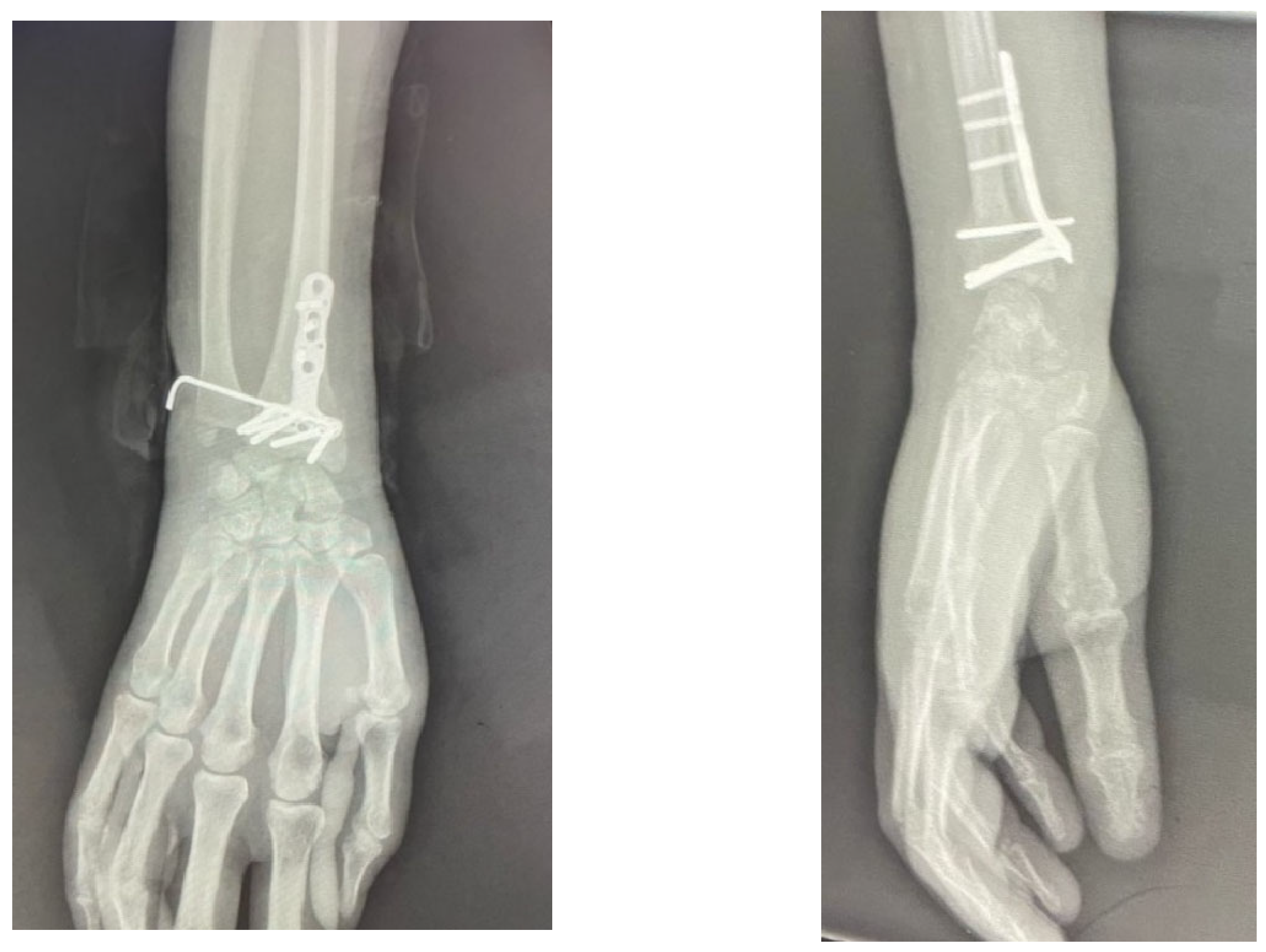- du Plessis, P.; Fournier, M.C. Management of complex wrist fractures with volar and dorsal locked (double-locked) K-lock. OTA Int. Open Access J. Orthop. Trauma 2023, 6, e286. [Google Scholar] [CrossRef]