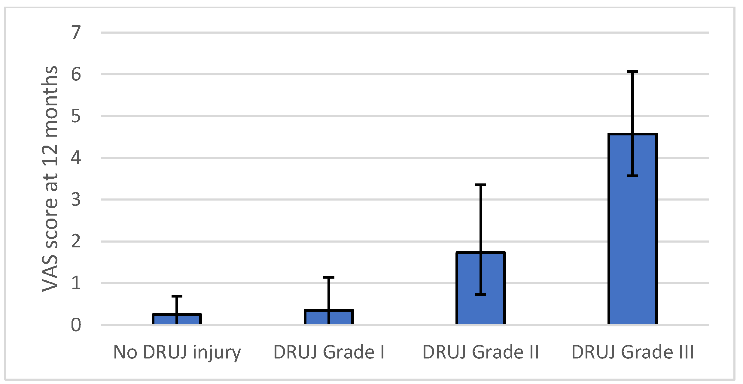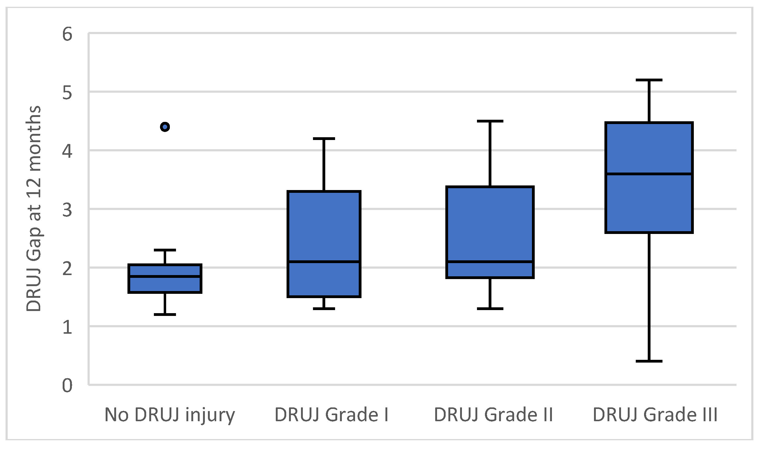 | Outcome | No DRUJ Injury (n = 20) | DRUJ Grade I (n = 46) | DRUJ Grade II (n = 40) | DRUJ Grade III (n = 14) |