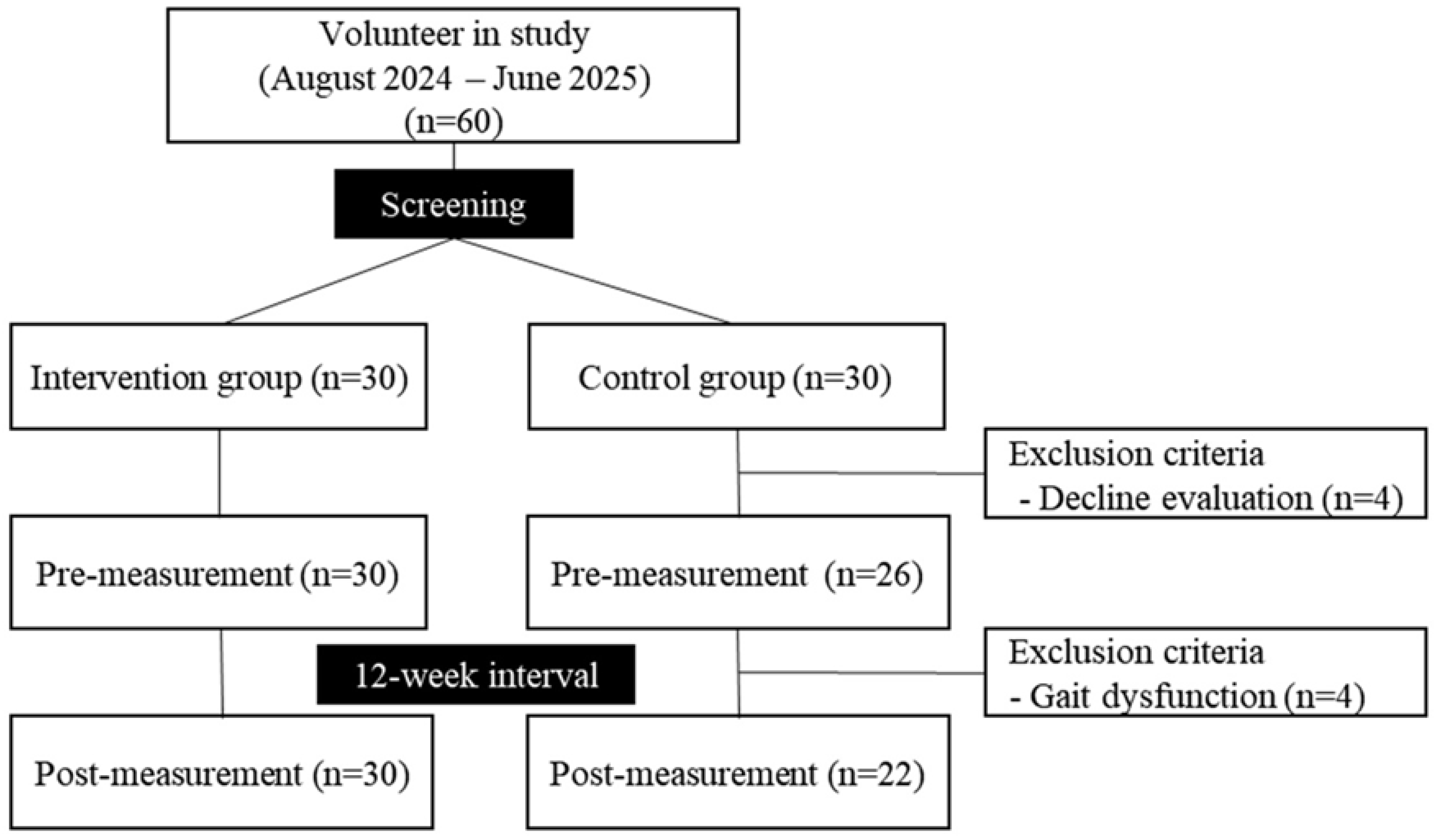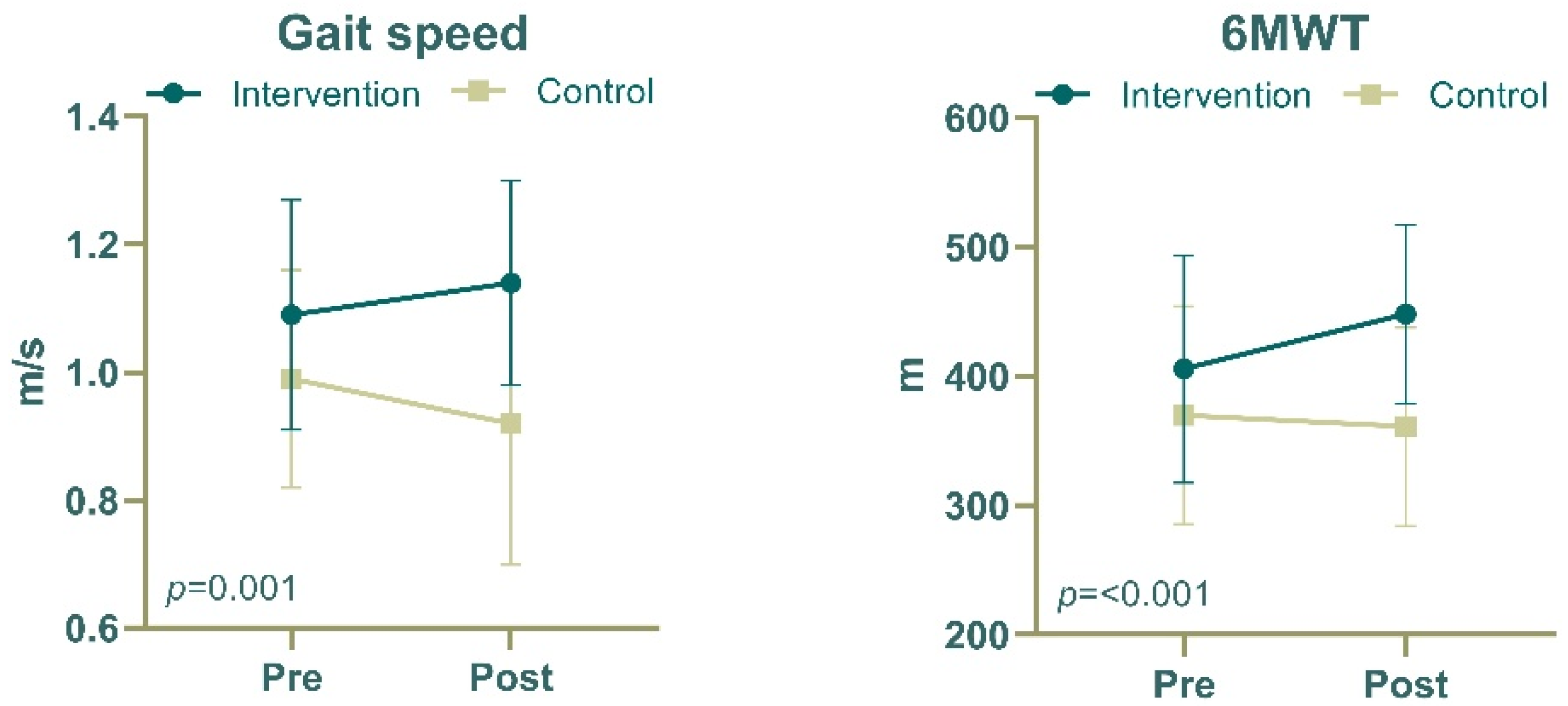 | Gait speed (m/s) | Intervention | 1.09 ± 0.18 | 1.14 ± 0.16 * | 12.615 | <0.001 |
