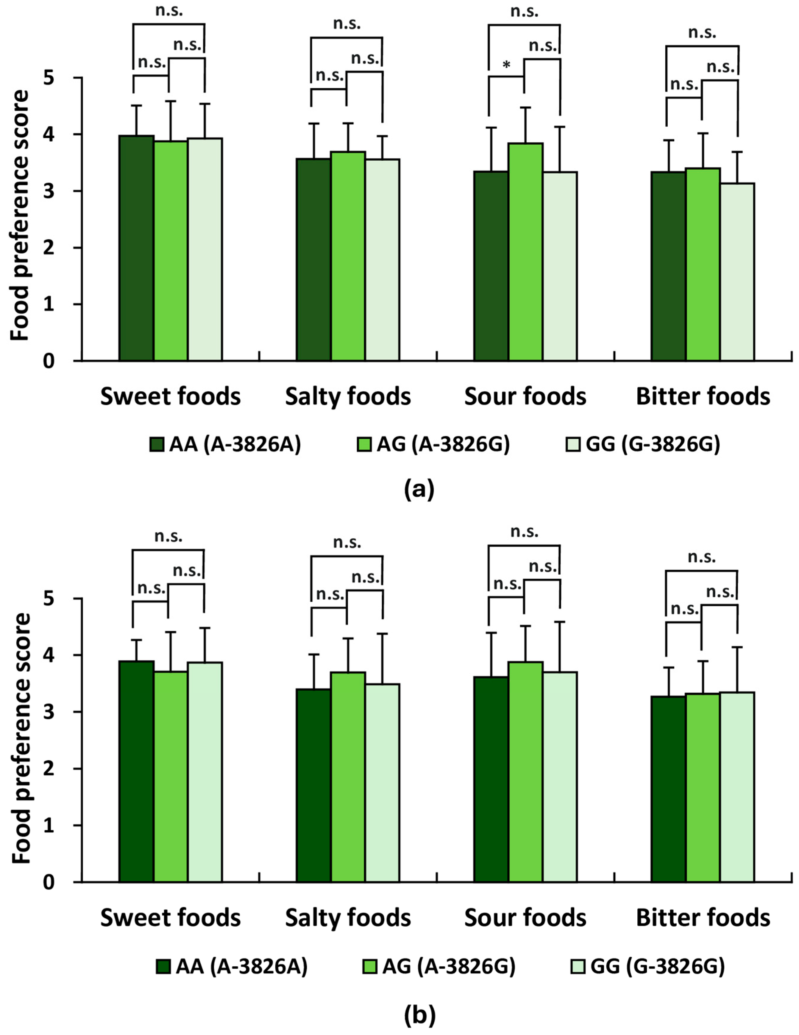 APA StyleKokubun, T., Kudo, T.-a., Tominami, K., Ishigaki, H., Matsushita, A., Izumi, S., Tanaka, T., Kawaguchi, K., Hayashi, Y., Sato, H., Shoji, N., Gengyo-Ando, K., Adachi, K., Nakai, J., & Hong, G. (2026). Effects of the Uncoupling Protein 1 (UCP1) A-3826G Polymorphism on Taste Preferences in Healthy Young Japanese Adults. Life, 16(3), 499. https://doi.org/10.3390/life16030499
