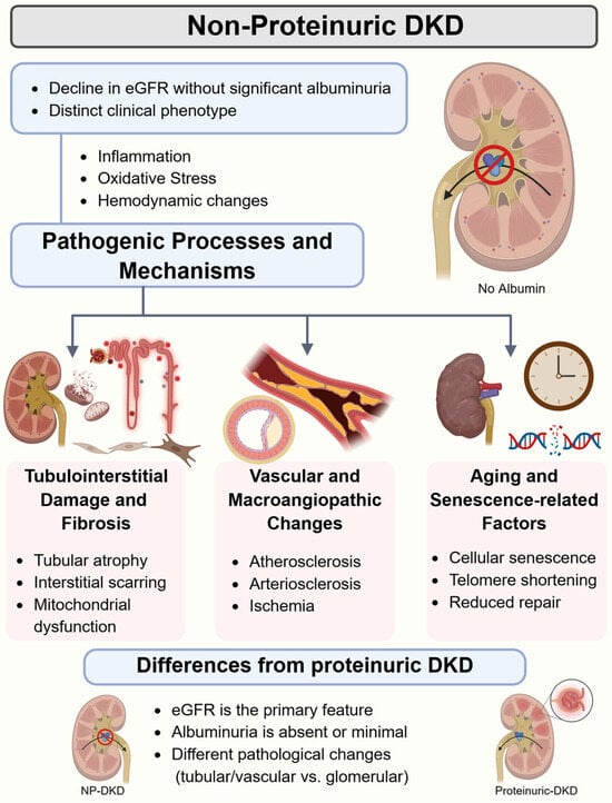 An overview of non-proteinuric diabetic kidney disease (NP-DKD) pathogenesis. eGFR: estimated glomerular filtration rate. Created in BioRender. Chatterjee, A. (2026) https://BioRender.com/n17yuws (accessed on 17 March 2026).
