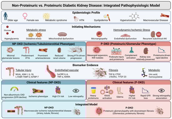 An integrated pathophysiologic model comparing non-proteinuric and proteinuric DKD. Arrows (upward or downward) indicate the expected change in biomarker levels (increase or decrease). HTN: hypertension, AKI: acute kidney injury, ROS: reactive oxygen species, AGEs: advanced glycation end-products, IFTA: interstitial fibrosis and tubular atrophy, NGAL: neutrophil gelatinase-associated lipocalin, KIM-1: kidney injury molecule 1, IL: interleukin, L-FABP: liver-type fatty acid–binding protein, TIMP-2: tissue inhibitor of metalloproteinases 2, IGFBP-7: insulin-like growth factor-binding protein 7, hsCRP: high-sensitivity C-reactive protein, TNF-α: tumor necrosis factor alpha, ADMA: asymmetric dimethylarginine, TGF-β: transforming growth factor-beta, CTGF: connective tissue growth factor, FGF-23: fibroblast growth factor 23, CKD: chronic kidney disease, GFR: glomerular filtration rate, CV: cardiovascular, RAAS: renin–angiotensin–aldosterone system, NP-DKD: non-proteinuric diabetic kidney disease, P-DKD: proteinuric diabetic kidney disease. Created in BioRender. Chatterjee, A. (2026) https://BioRender.com/4fk8oxb (accessed on 17 March 2026).