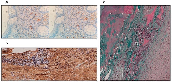 A rectal biopsy was performed. The small specimen revealed IgG- and IgG4-positive plasma cells in perivascular spaces (Figure 1a), with a ratio of 30%, below diagnostic thresholds, and no storiform fibrosis or obliterative phlebitis due to its limited size.