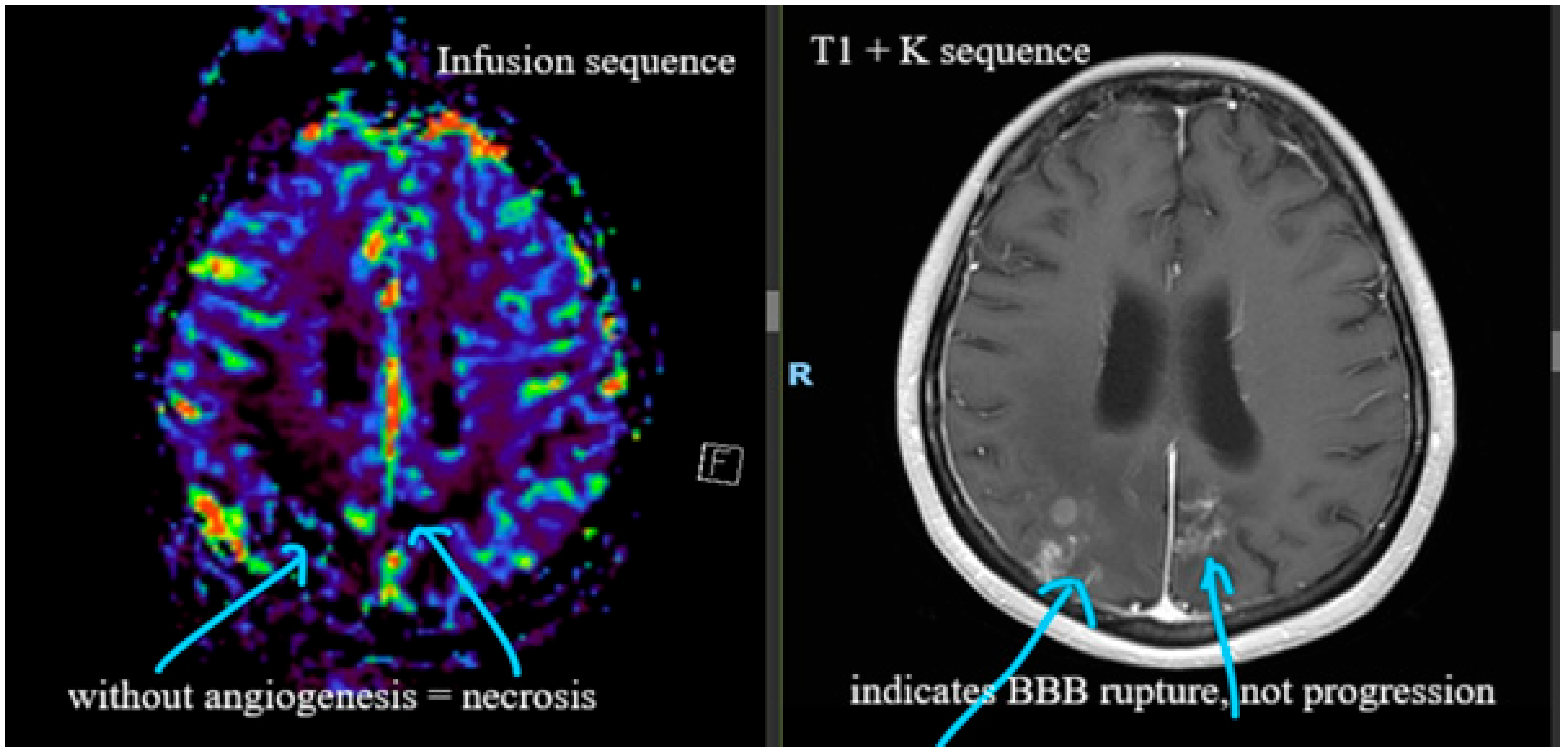 - Magnetic Resonance Perfusion (a technique that provides information on blood volume, blood flow, and permeability) [14]. Regarding TP, this technique shows high relative cerebral blood volume (rCBV) and peak height due to neo-angiogenesis. Regarding BRN, this technique shows low rCBV because radiation-induced vascular damage reduces blood flow.