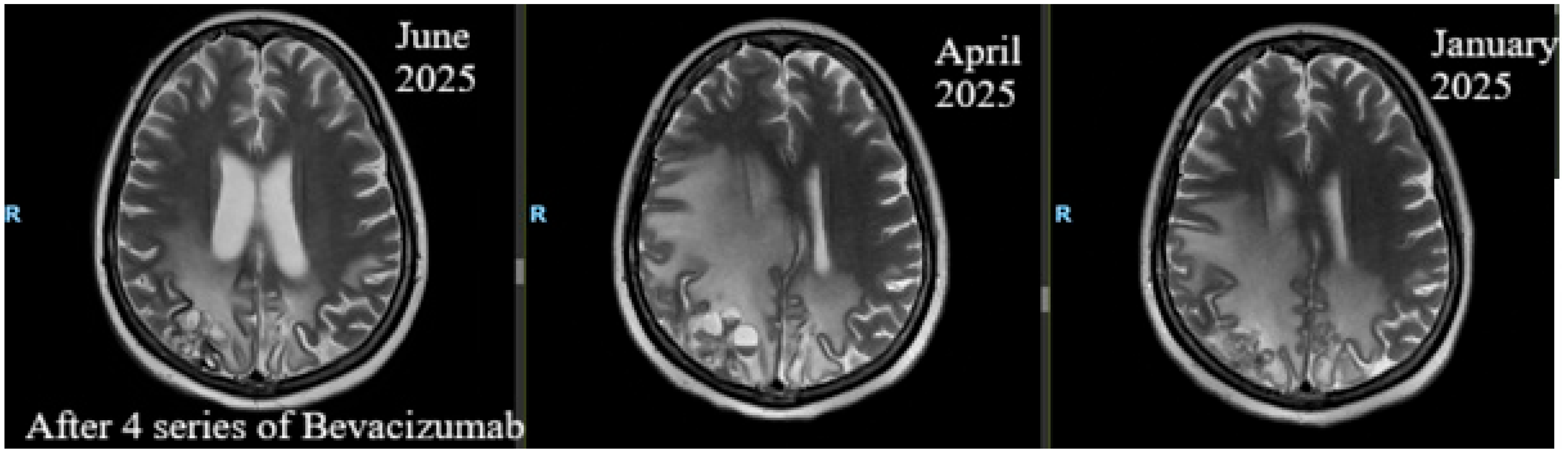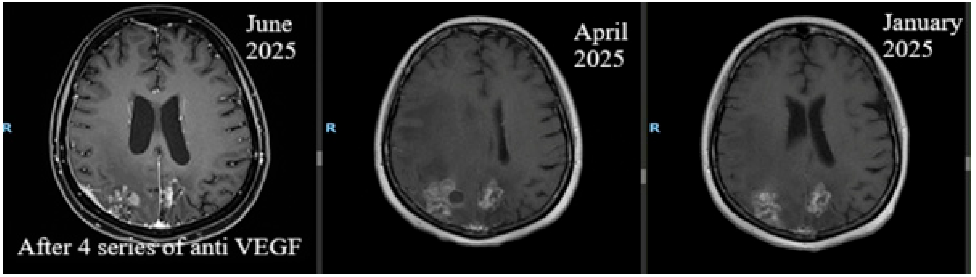 | 6. | 2025 | May: neurologic hemiparesis clinical status of 4/5 brachial and 3/5 crural; possible walking with unilateral support; Karnofsky Performance Status (KPS) = 60–70%. May–July: 4 cycles of bevacizumab 400 mg/cycle, KPS = 80–90%. July: brain perfusion MRI showed improved intra-axial post-therapeutic changes, but pachymeningeal thickening persisted. October: PET-CT showed no metabolic activity. The patient refused injectable systemic oncological treatment and continued and continued with Fulvestrant and ovarian suppression therapy. |