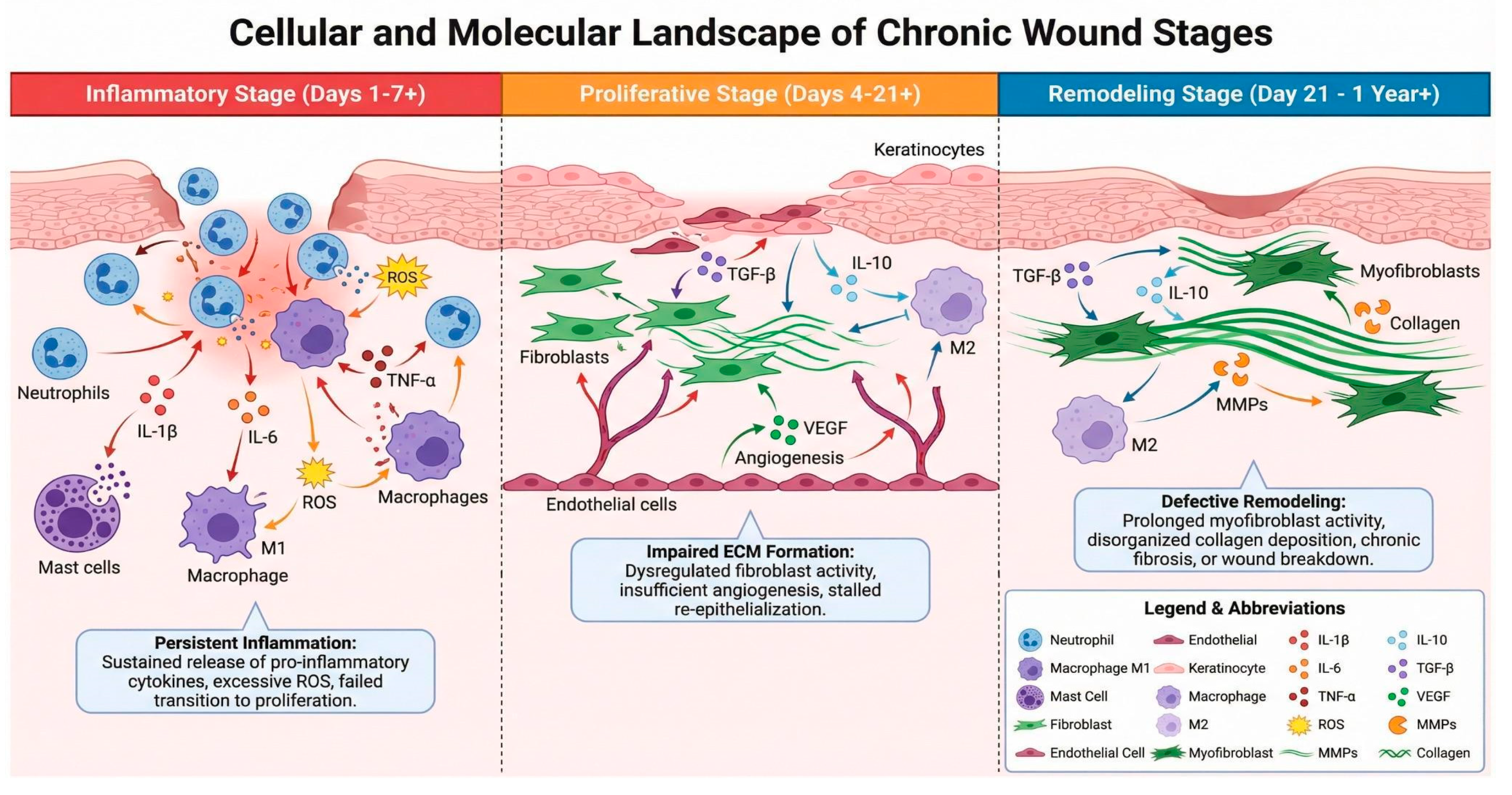 | Fu et al. 2026 [26] | Adipose-derived decellularized ECM (dECM) pre-gel blended with GelMA and HAMA | Human adipose-derived stem cells (hADSCs) loaded into printed scaffold | No exogenous GF reported (hADSC paracrine activity) | 3D printing of dECM-GelMA-HAMA constructs | Full-thickness dorsal wounds in nude mice | 3D-printed constructs accelerated wound closure, reduced inflammation, increased blood perfusion, promoted re-epithelialization, angiogenesis, and collagen deposition. |