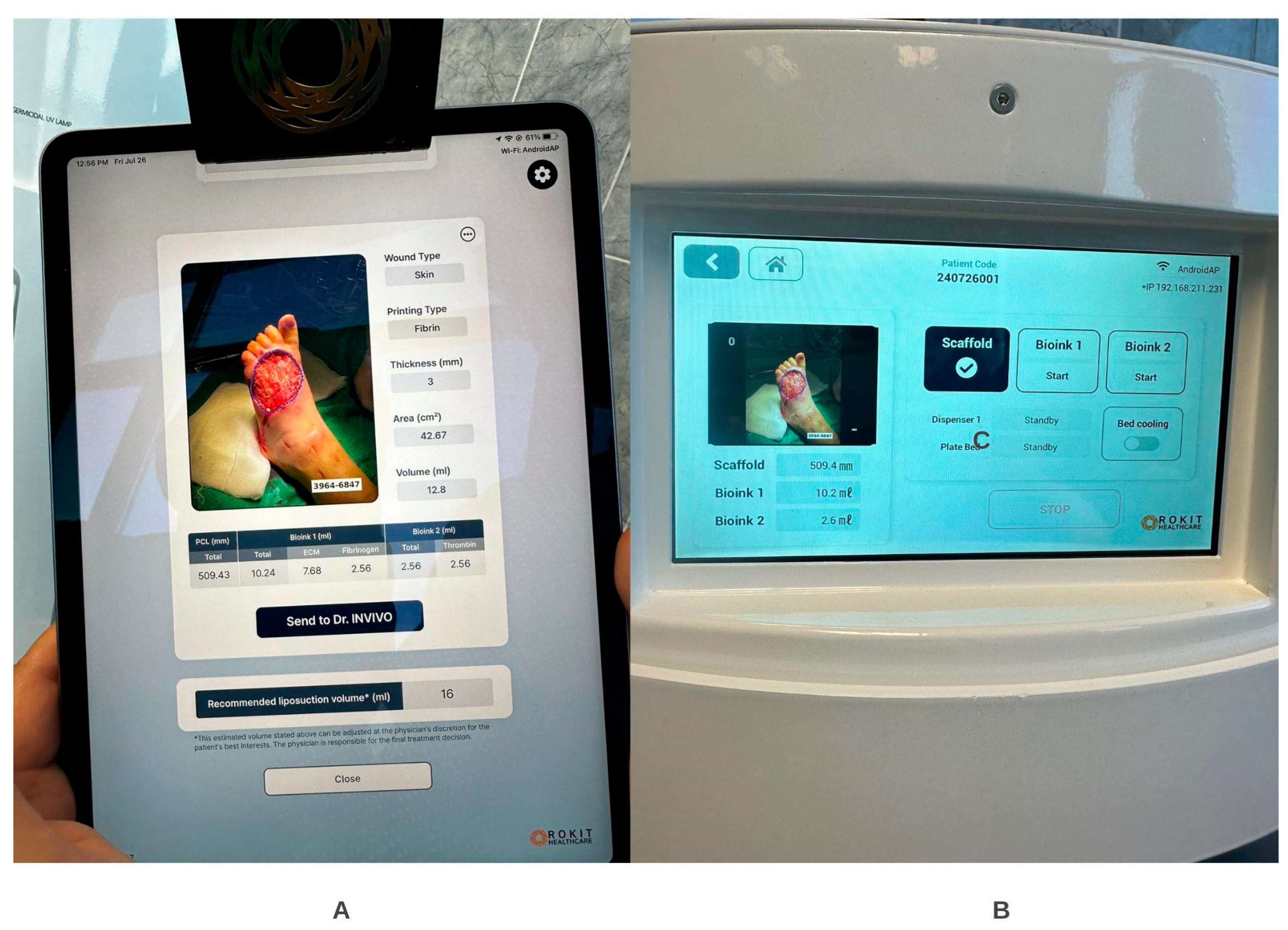 - Kesavan, R.; Sheela Sasikumar, C.; Narayanamurthy, V.B.; Rajagopalan, A.; Kim, J. Management of Diabetic Foot Ulcer with MA-ECM (Minimally Manipulated Autologous Extracellular Matrix) Using 3D Bioprinting Technology—An Innovative Approach. Int. J. Low. Extrem. Wounds 2024, 23, 161–168. [Google Scholar] [CrossRef] [PubMed]