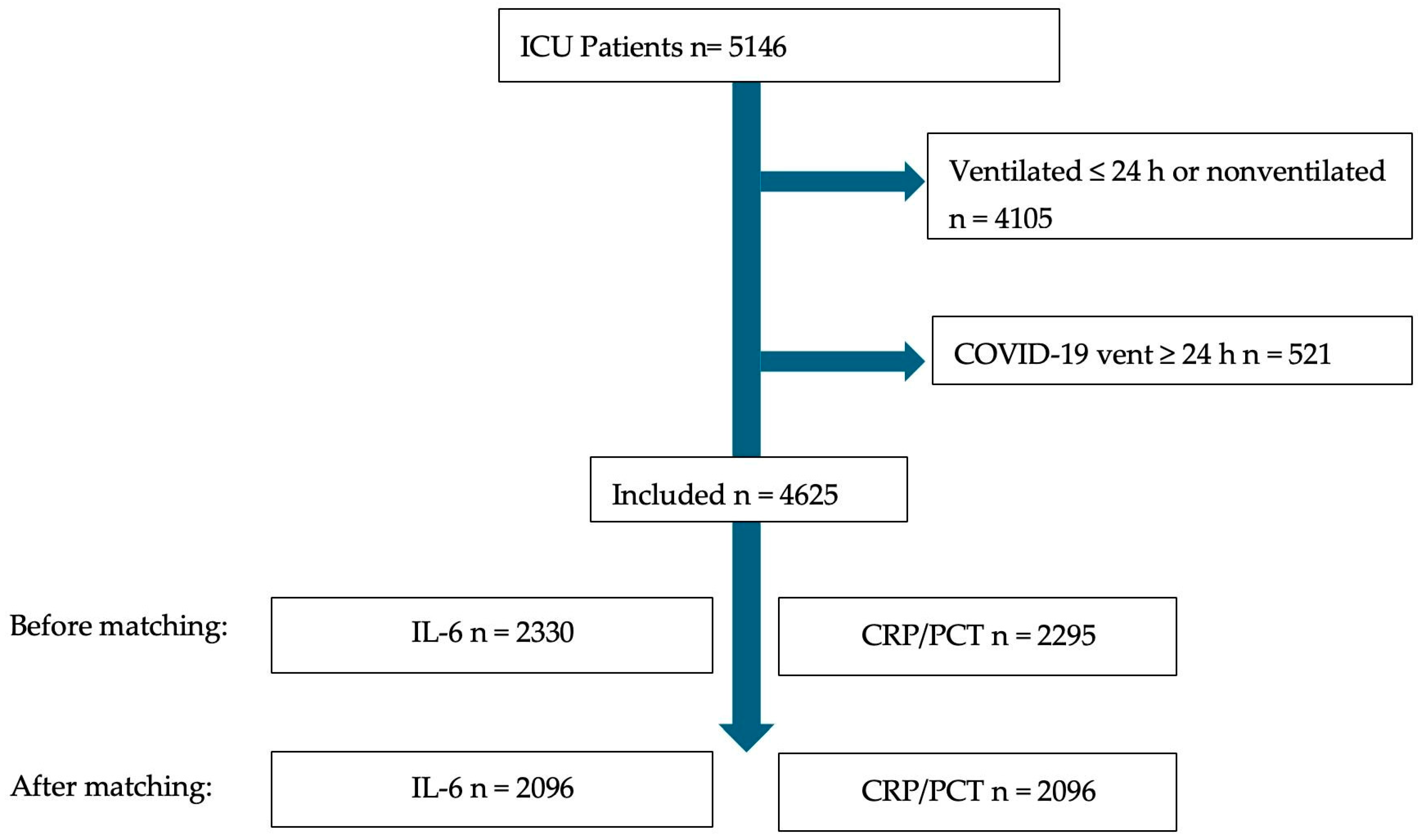 Chicago/Turabian StyleBexten, Tobias, Rumen Kasabov, Stefan Bushuven, Anne Kamphausen, Verena Schneider-Lindner, and Holger A. Lindner. 2026. "Interleukin-6 in Daily Use in the Intensive Care Unit: Does It Change the Patients’ Outcome and Antimicrobial Prescription? An Explorative Study" Life 16, no. 4: 590. https://doi.org/10.3390/life16040590