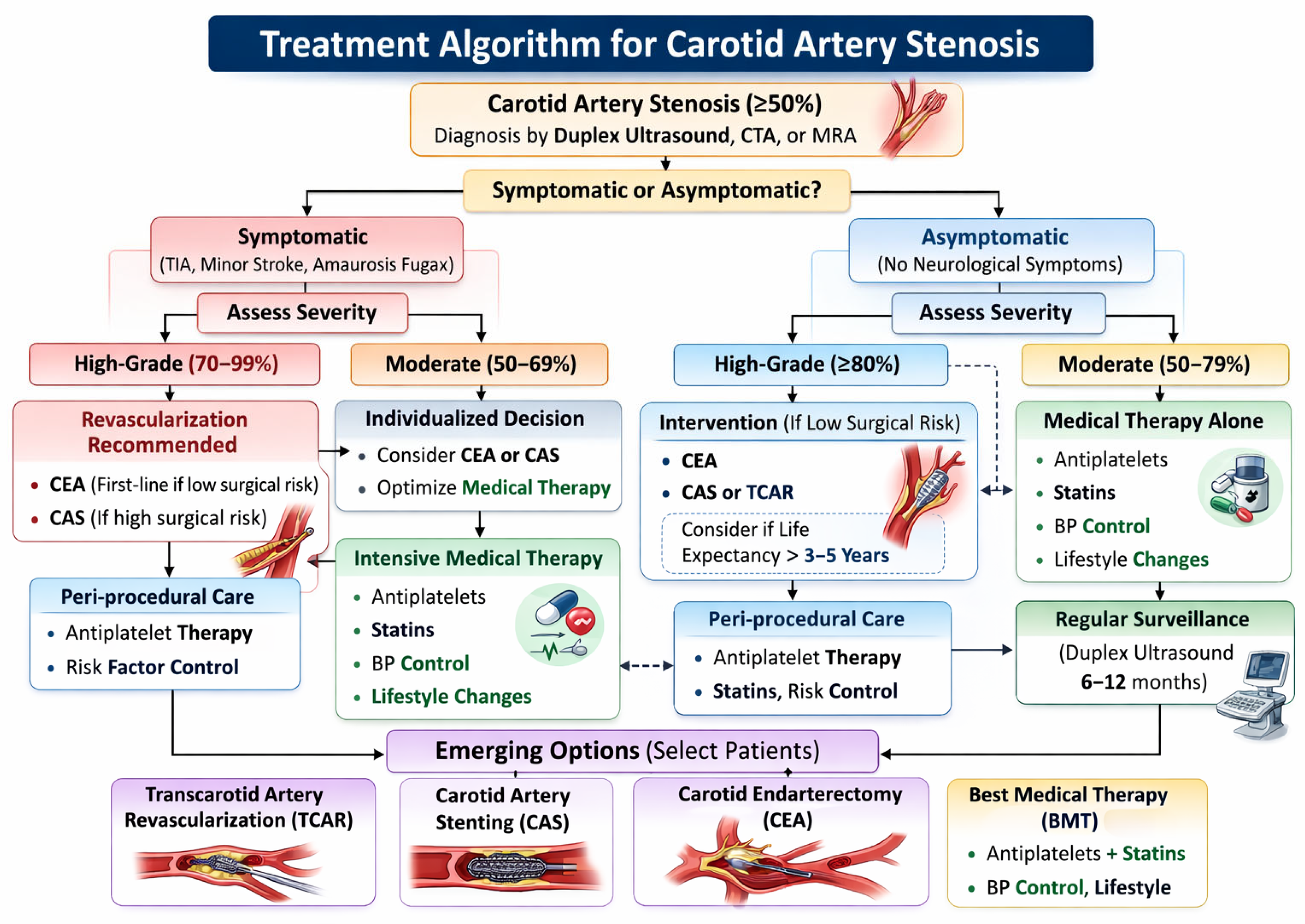 | Medical Therapy | Antiplatelet therapy, statins, blood pressure control, risk factor optimization | CREST-2 (CAS + medical vs. medical alone; CEA + medical vs. medical alone) | Reduces stroke risk, particularly in asymptomatic patients; foundation of modern management |