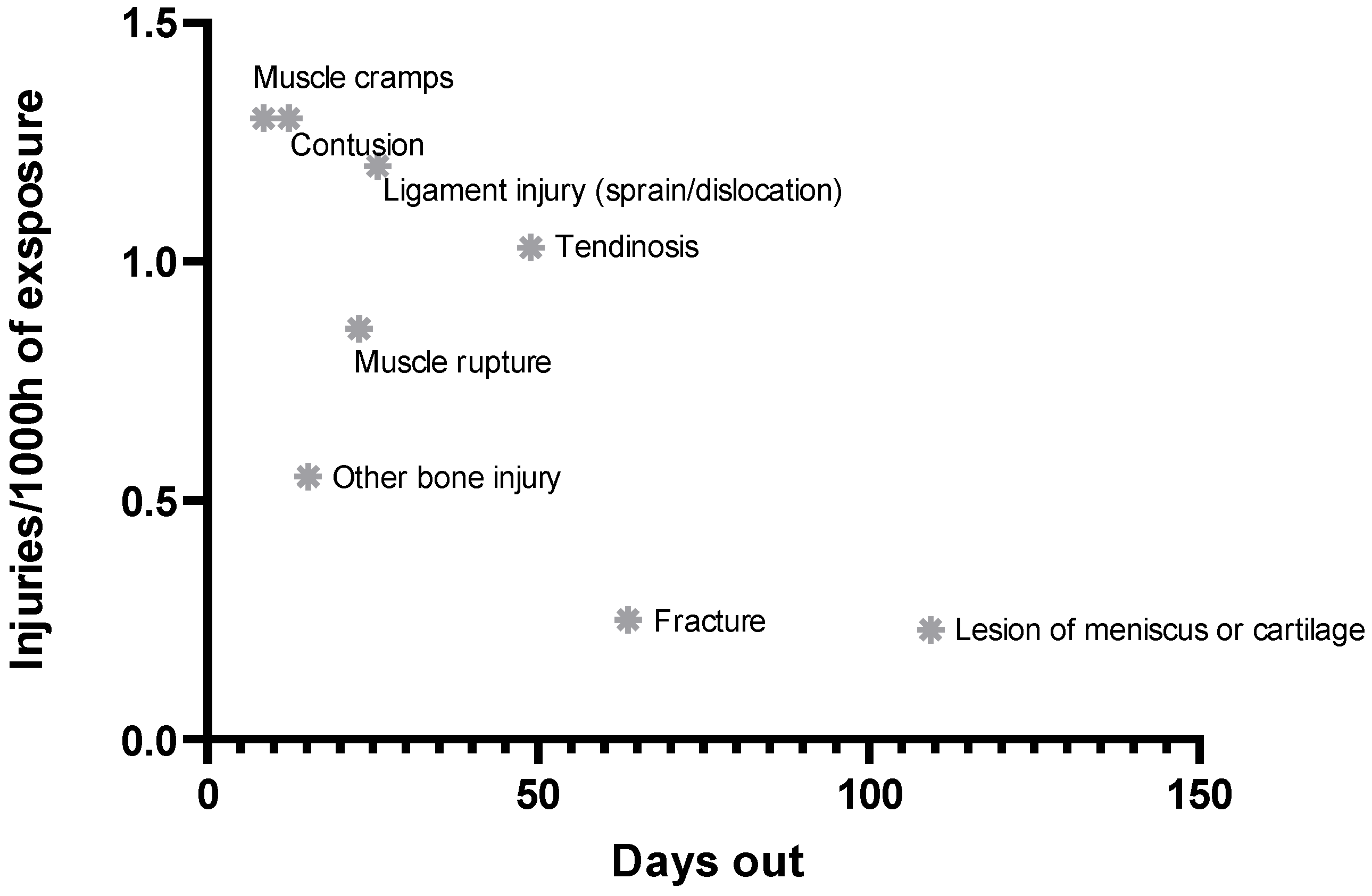 | Injury Type | Number of Injuries | Days Out | Reinjury (n) | Training (n) | Match (n) | Non-Contact (n) |